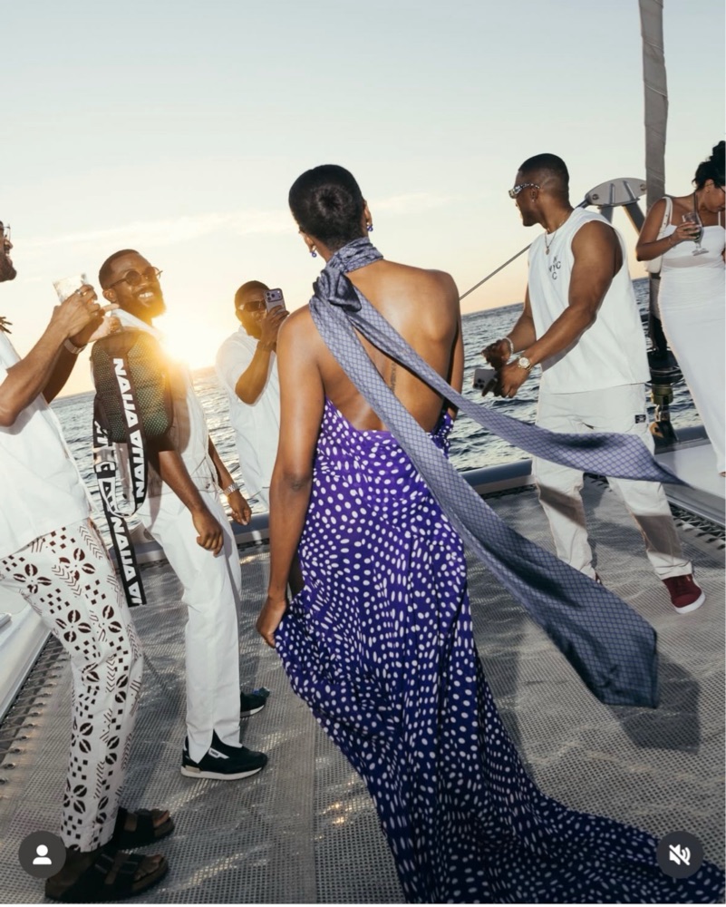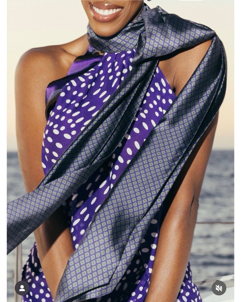 Stunning and unique floor-length halterneck gown featuring an irregular polka dot print and a dramatic scarf collar. Size EU 38 perfect for a small or small/medium.