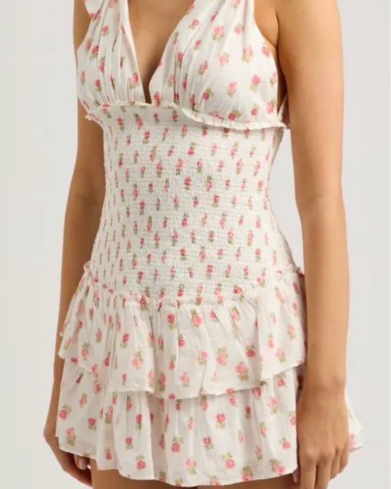 Loveshackfancy mini floral dress. This playful floral dress is perfect for a sunny day out with friends or a fun summer event. The ruffled skirt and v-neckline create a flirty, feminine look.