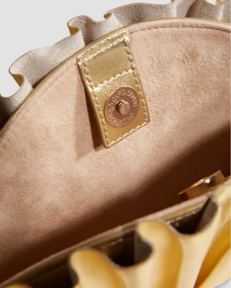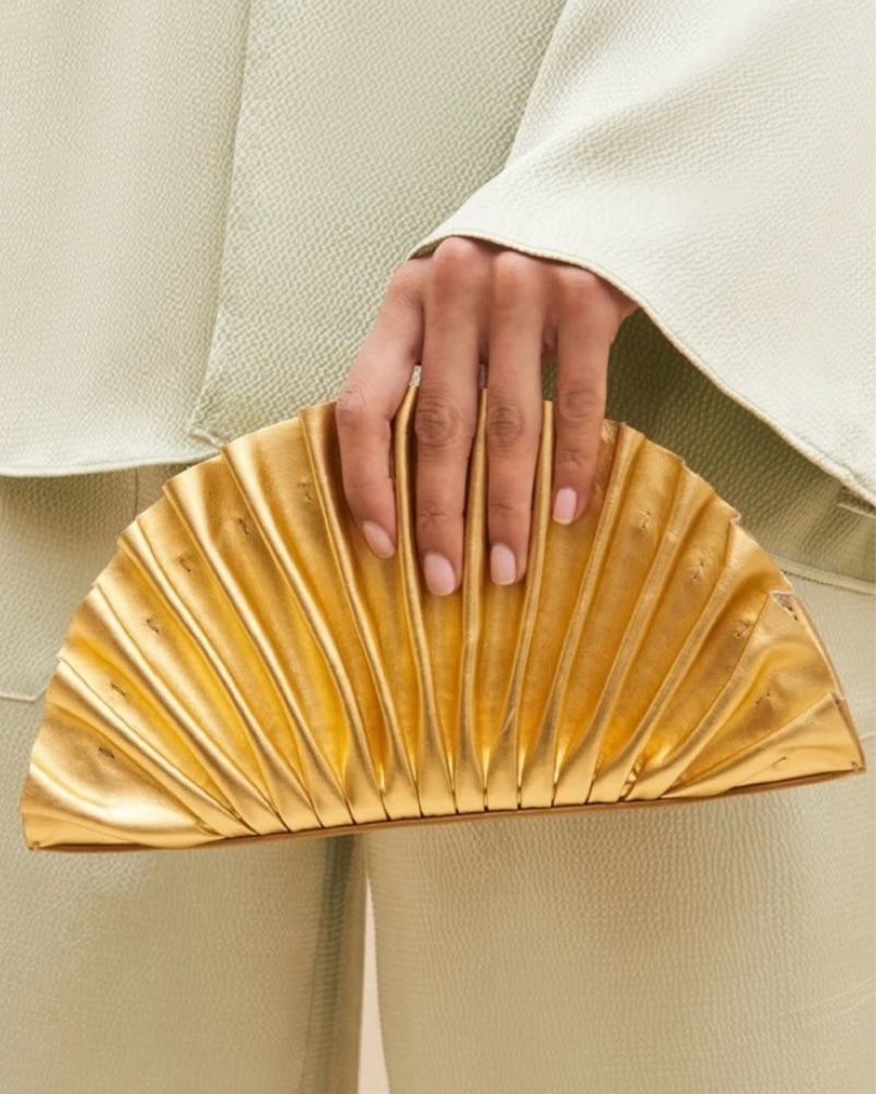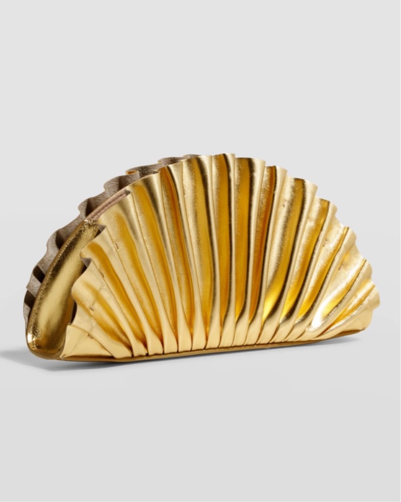 Wearable art, the Nala Mini Clutch is a fanned-style clutch created with pleated metallic-hued smooth napa leather. The shell shaped silhouette comes in an eye-catching shiny Gold and an invisible magnetic closure keeps all of the essentials safe.