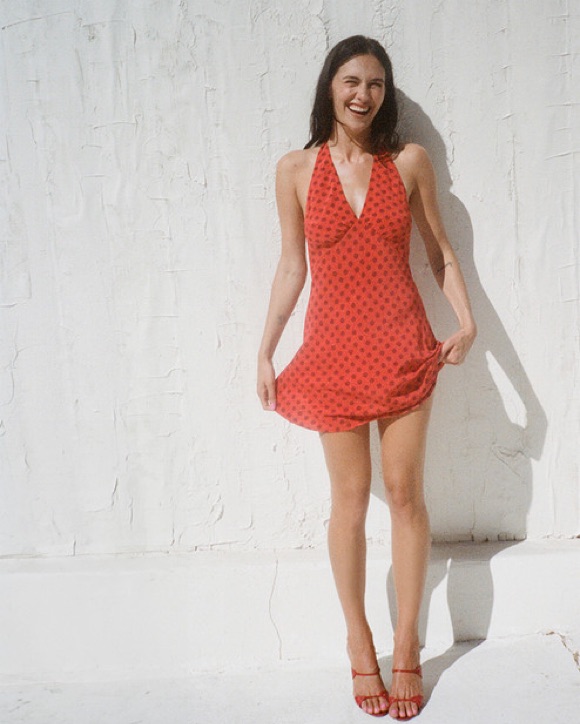 Sold out! Backless with a Marilyn Monroe style halter top - the Leila in Aura will have you grabbing your Mulholland glasses, letting your hair down and buzzing off on the back of a motorbike until the sun comes up. Short but not too mini, the red polka dot Leila will have you teleported right to th