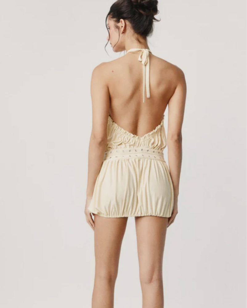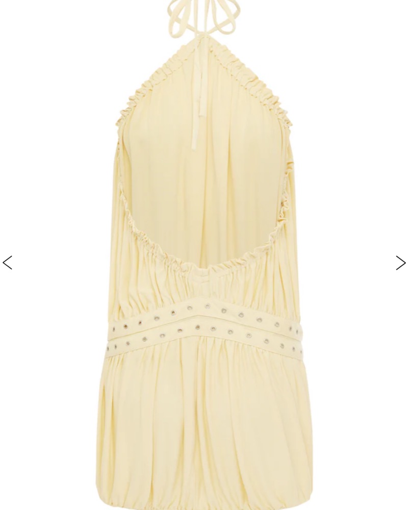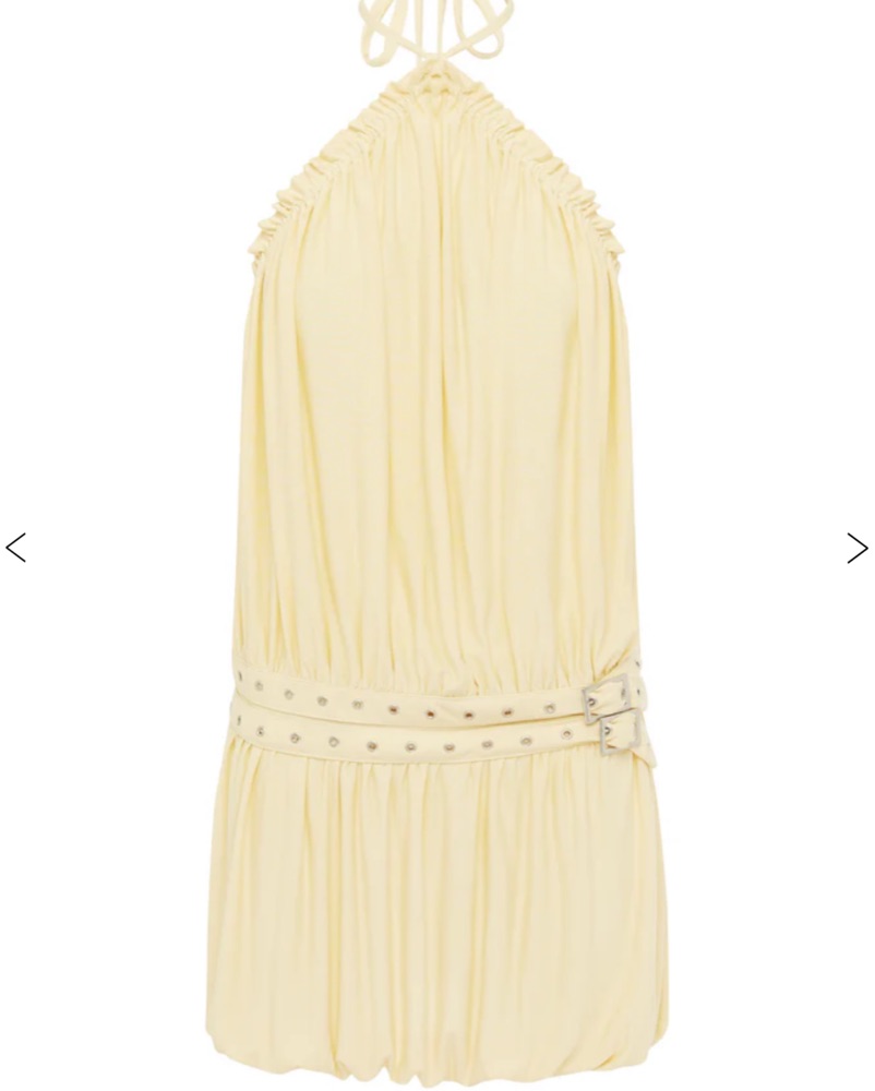 The perfect mini dress. The Magnol Dress is a halter-neck dress with a self-tie strap, double waist eyelet straps with buckle details at the hip