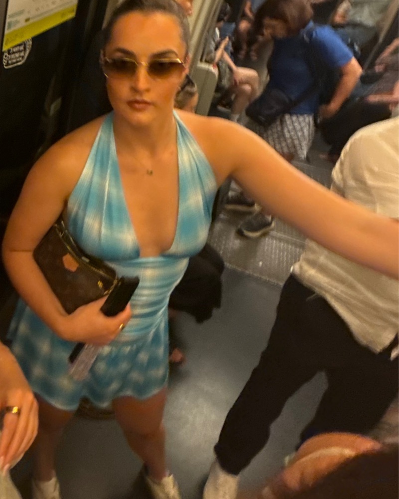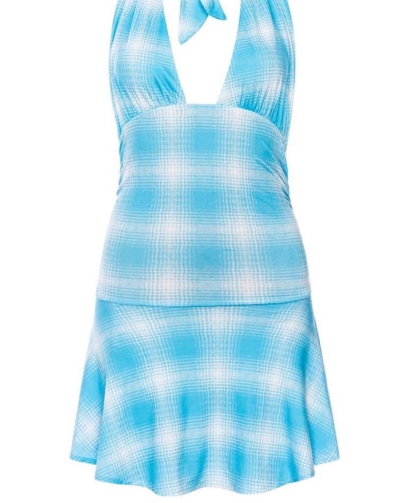 MIAOU NATALIA DRESS - GHOST GINGHAM TURQUOISE. Dress features a tie-halter, waist ruching, and a flared, flowy mini skirt with built-in shorts.
