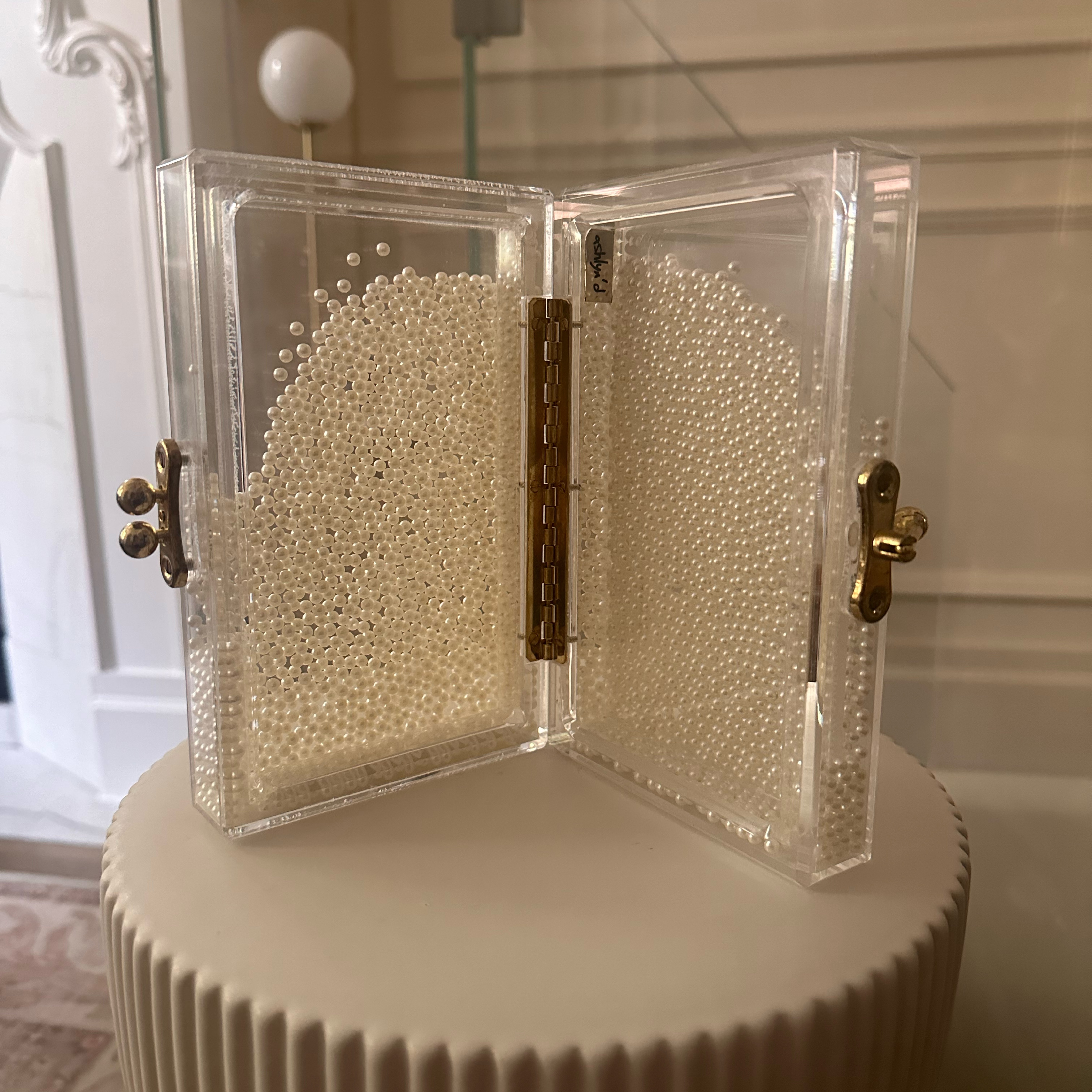 Super fun acrylic purse filled with pearl like beads and gold hardware. It can fit a card holder, phone and lipstick very easily. 7x4.5x 2.25in