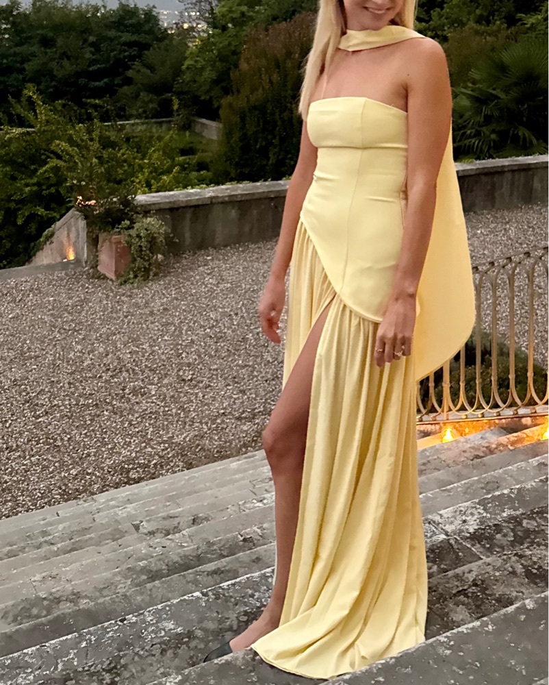 Curved asymmetrical hem on bodice.
