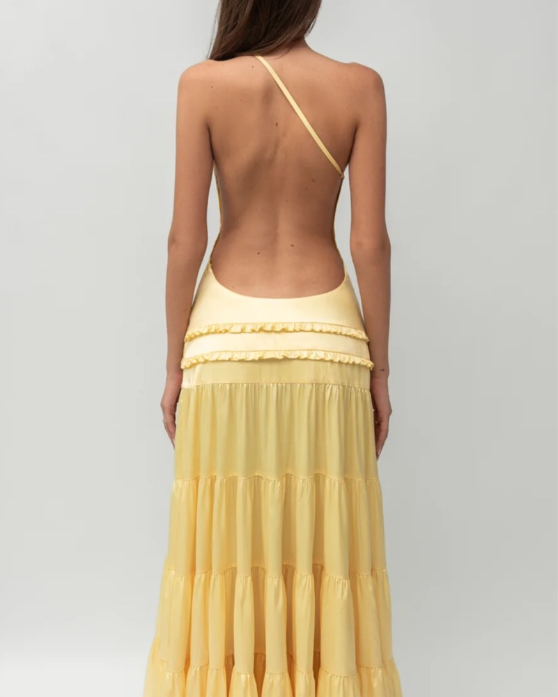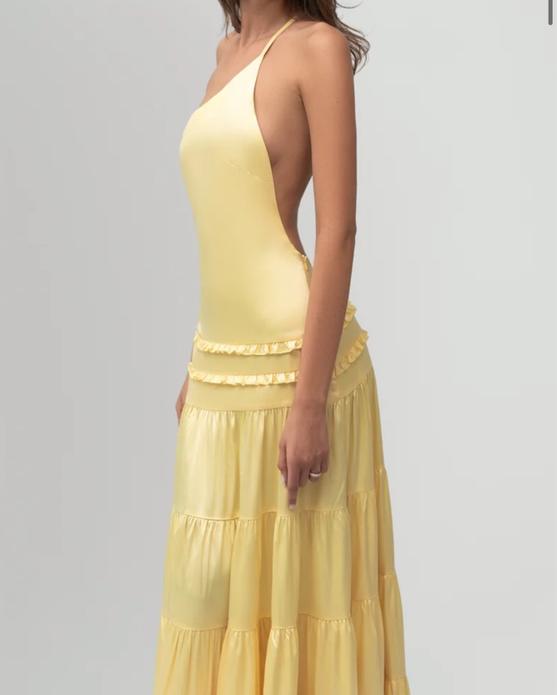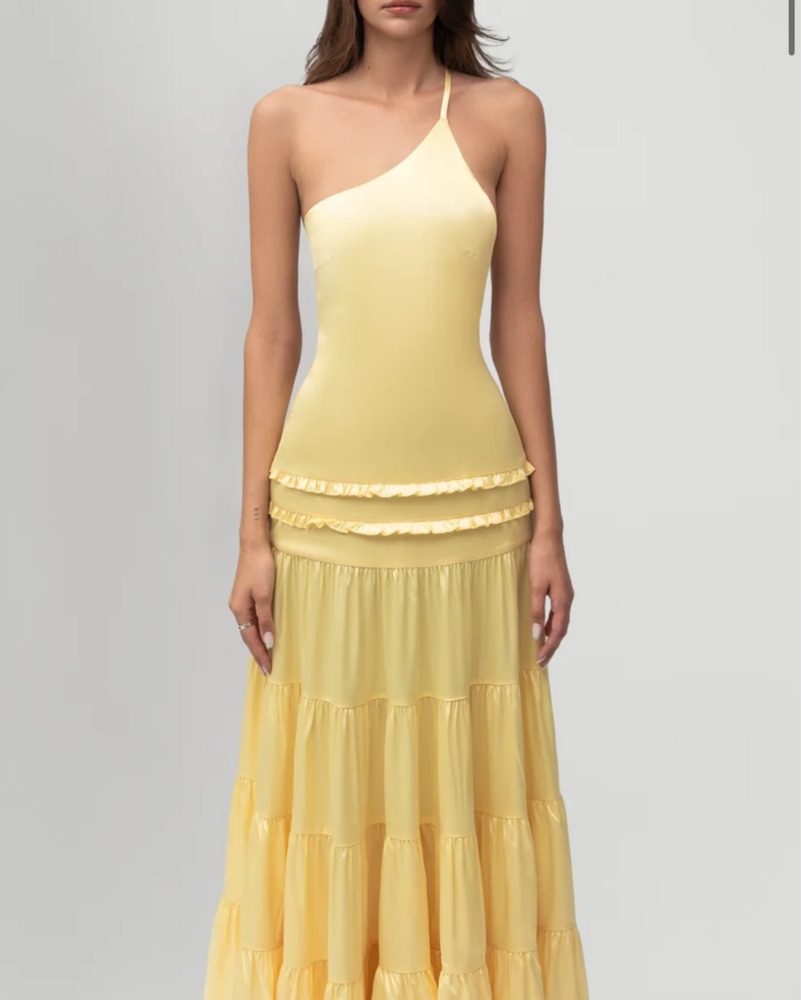 This vibrant yellow dress with ruffle detailing is perfect for a summer wedding or evening event. The asymmetrical neckline and flowing skirt create a flattering silhouette.