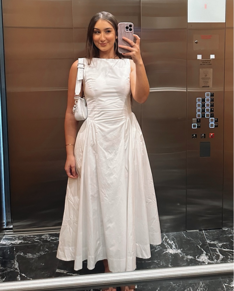 This beautiful white midi dress is perfect for a formal event or special occasion. The flowing, A-line silhouette and structured bodice create a flattering, feminine look.