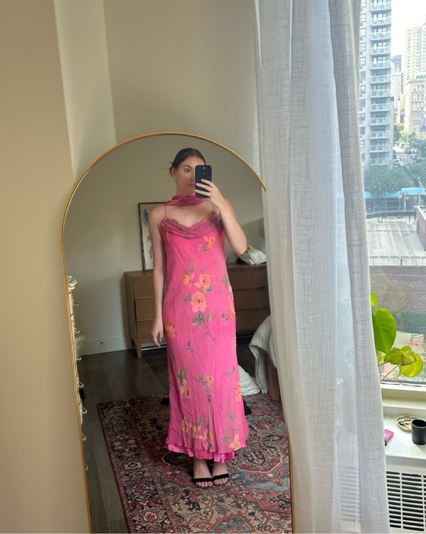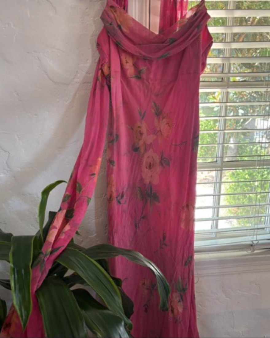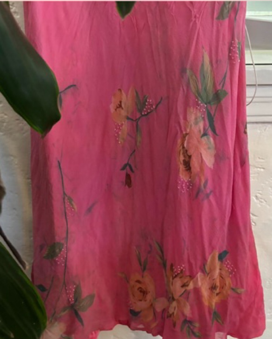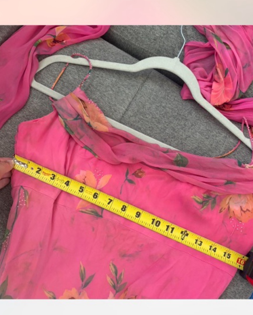 Vintage pink floral silk beaded dress with scarf. No size but fits like a small. Im 5’7 and it hits my ankles. The pink slip peaks out a little but you can pin it. This is a preloved vintage item so there’s some missing beads, snags & marks throughout (kinda looks like part of dress). Pickup only!