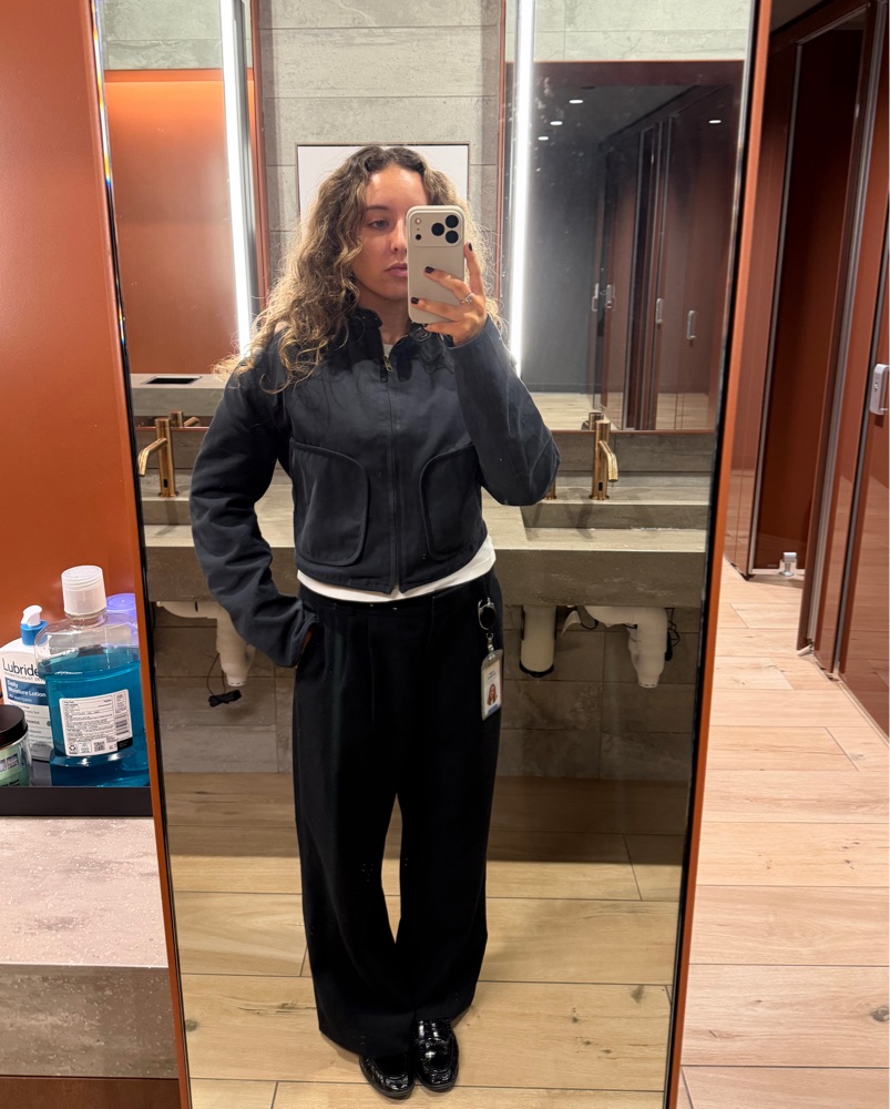 Cropped bomber in a navy/gray color. Cute zipped up or open