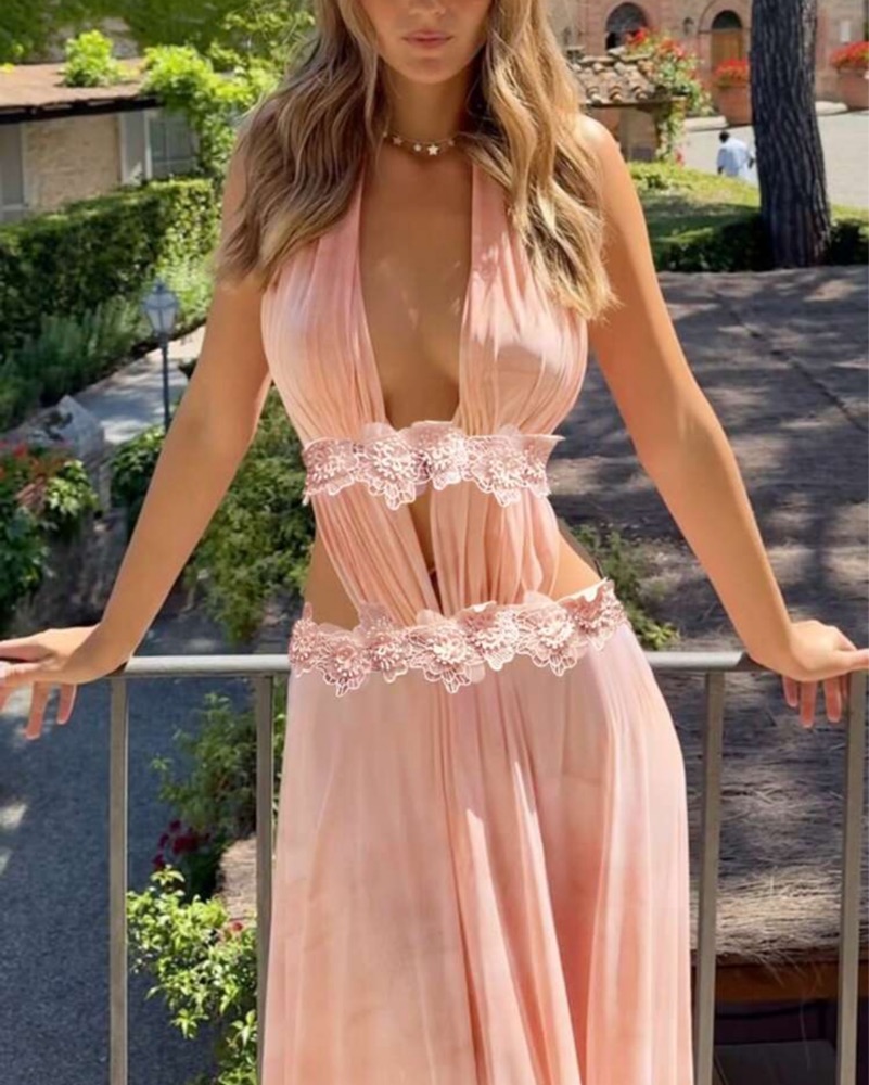 A stunning blush pink maxi dress with intricate lace detailing. Perfect for a formal event or special occasion.