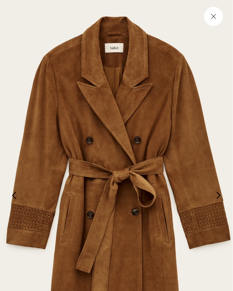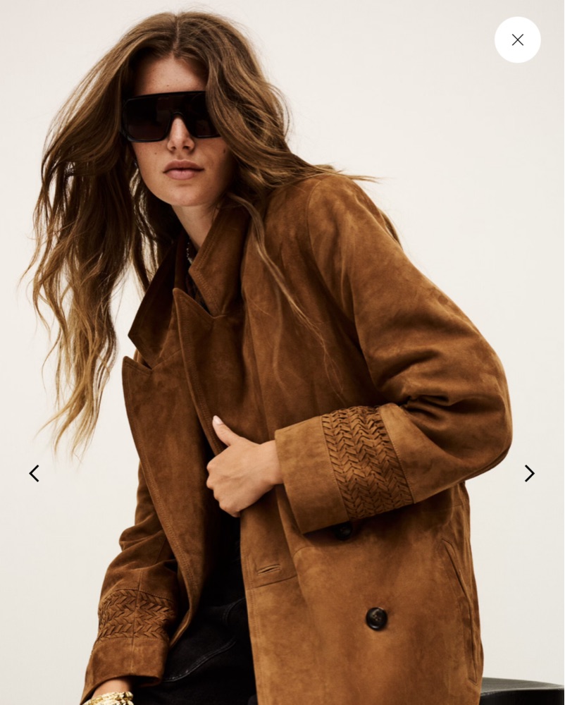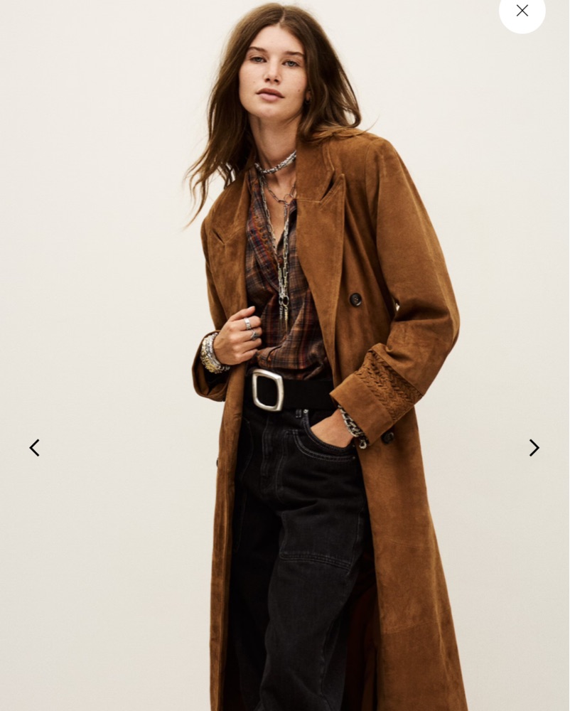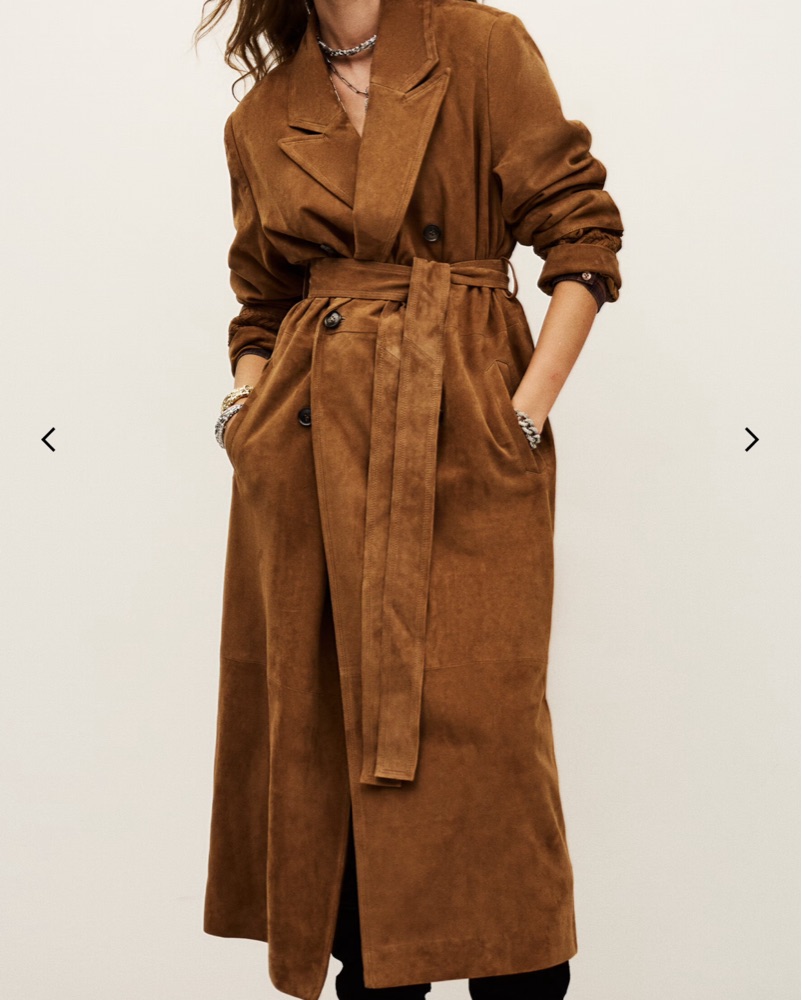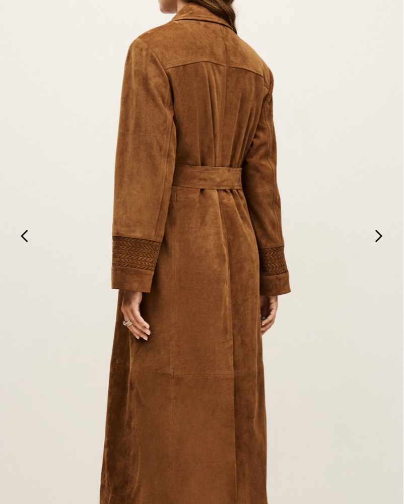 100% genuine leather suede with a satin lining. It is a rich camel color with a large rear slit double breasted and embroidered cuff details. It is super long for a chic, rock 'n' roll style look. Please be careful as suede is so hard to clean and renters will be responsible for all damages.