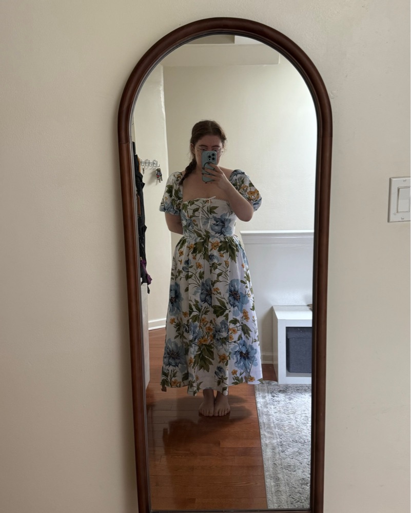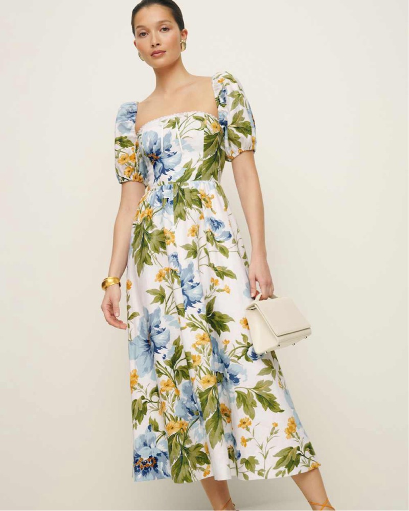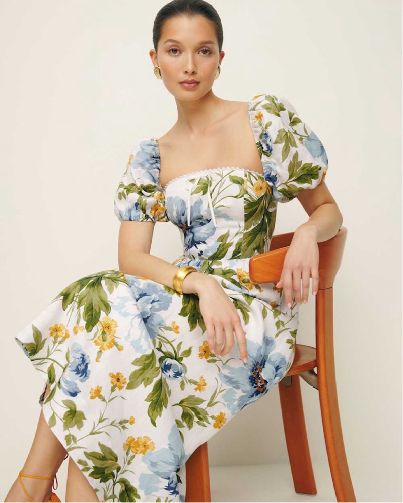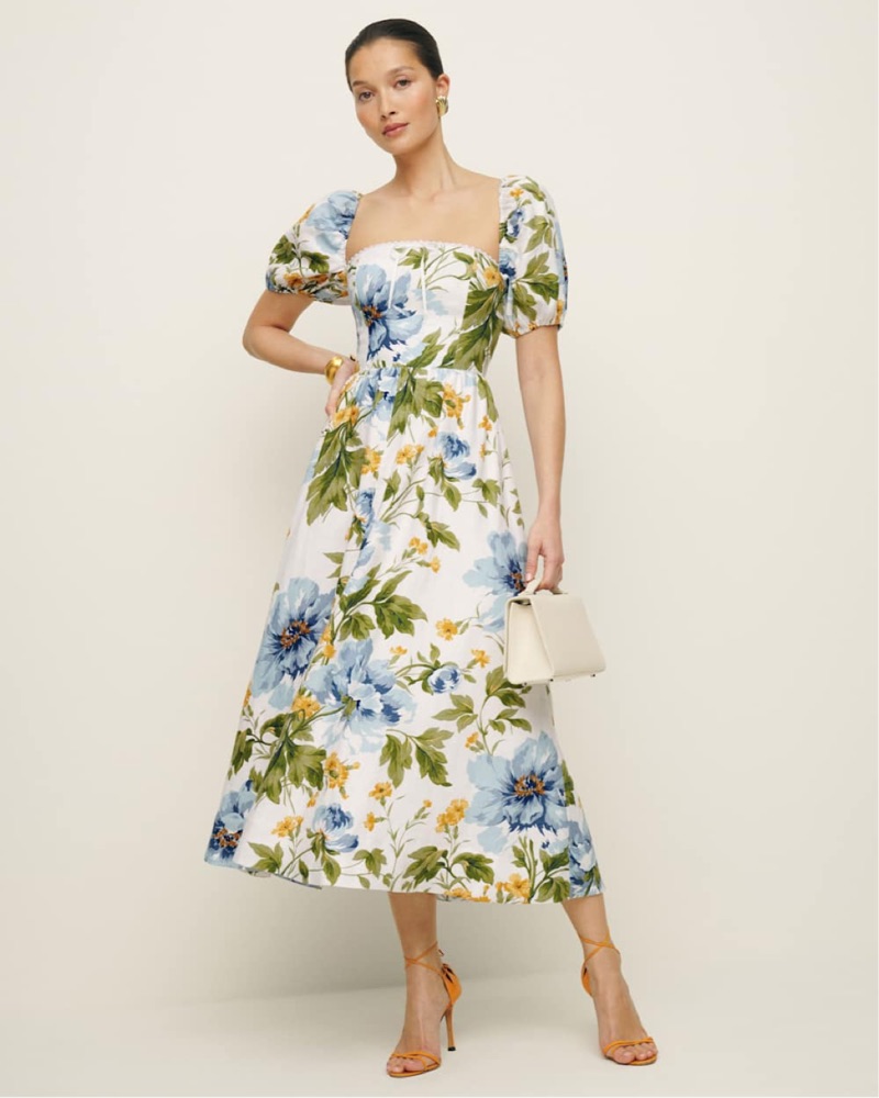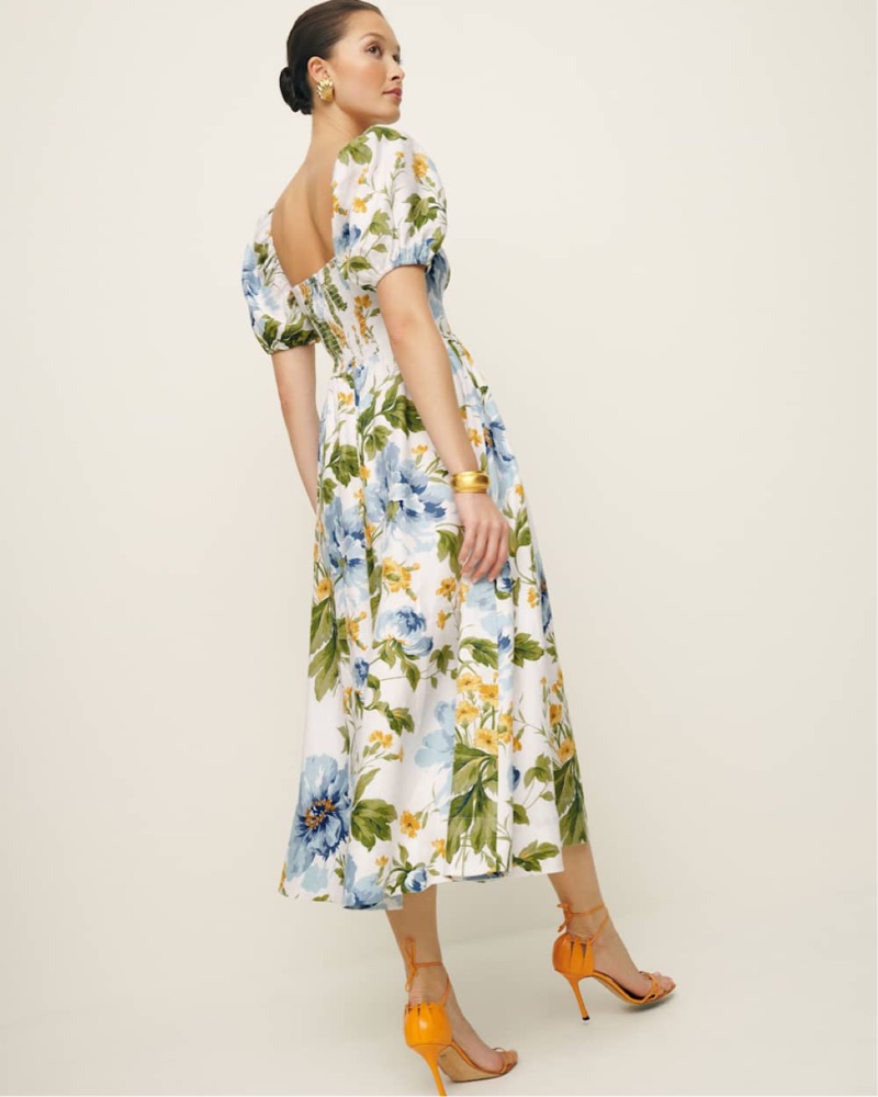 This beautiful floral midi dress features a flattering puff sleeve design, perfect for an elegant occasion or a summer garden party.