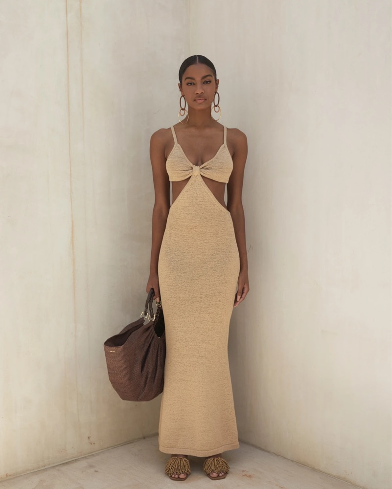 Tan cutout woven knit maxi dress. Sooo flattering and cute for beach/vacation. As seen on Hailey Bieber. Please don’t hang as it is knit and will stretch!
