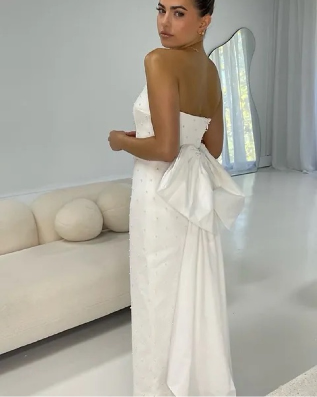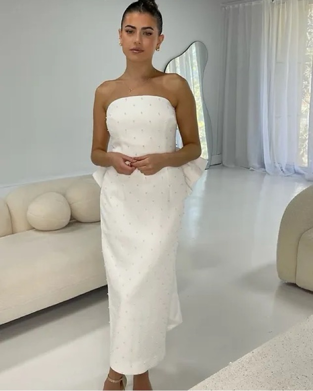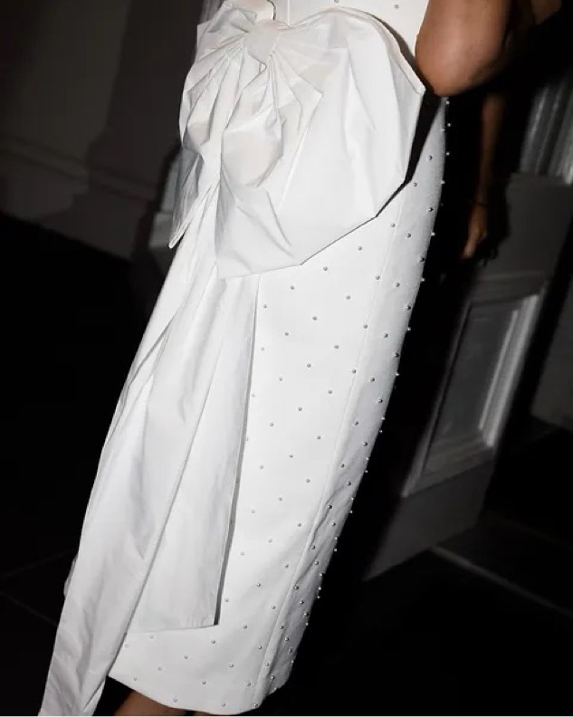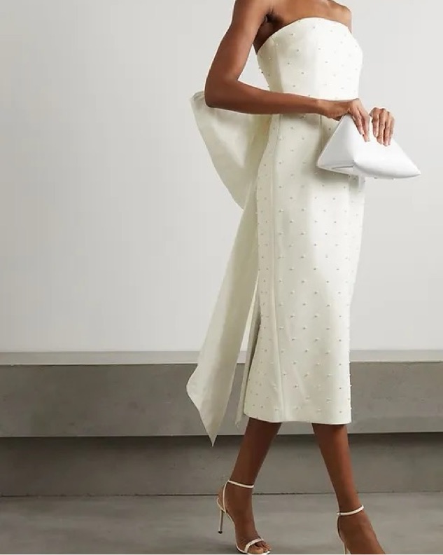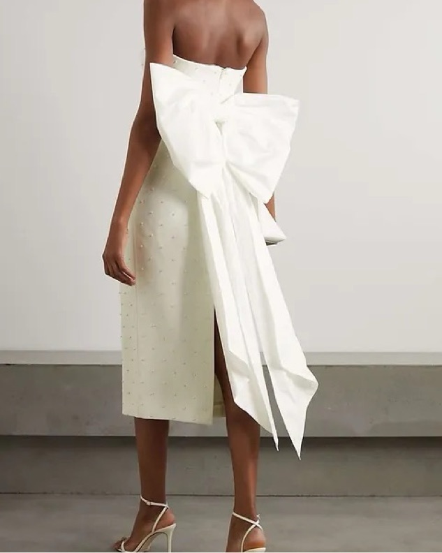Fits size 2/4. Perle bow midi dress from REBECCA VALLANCE featuring ivory white, faux-pearl detailing, oversize detachable bow detail, square neck, concealed rear zip fastening, straight hem and fitted silhouette.