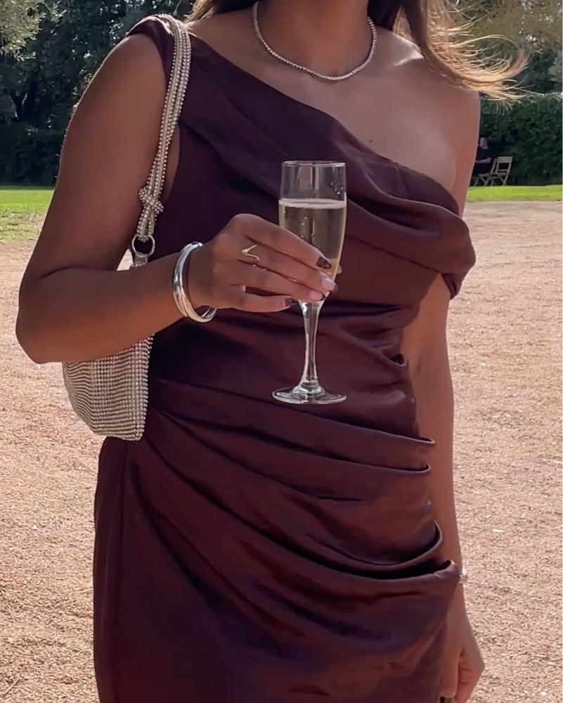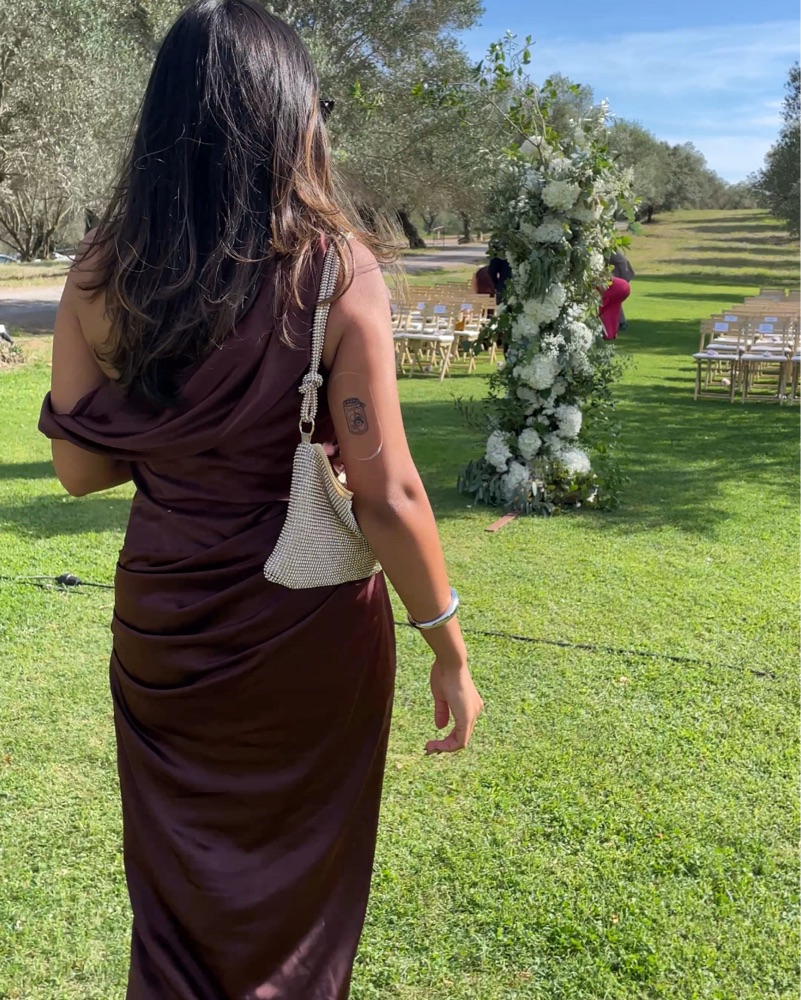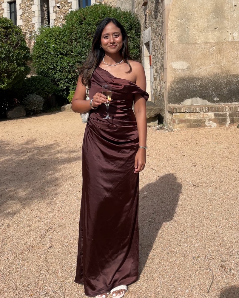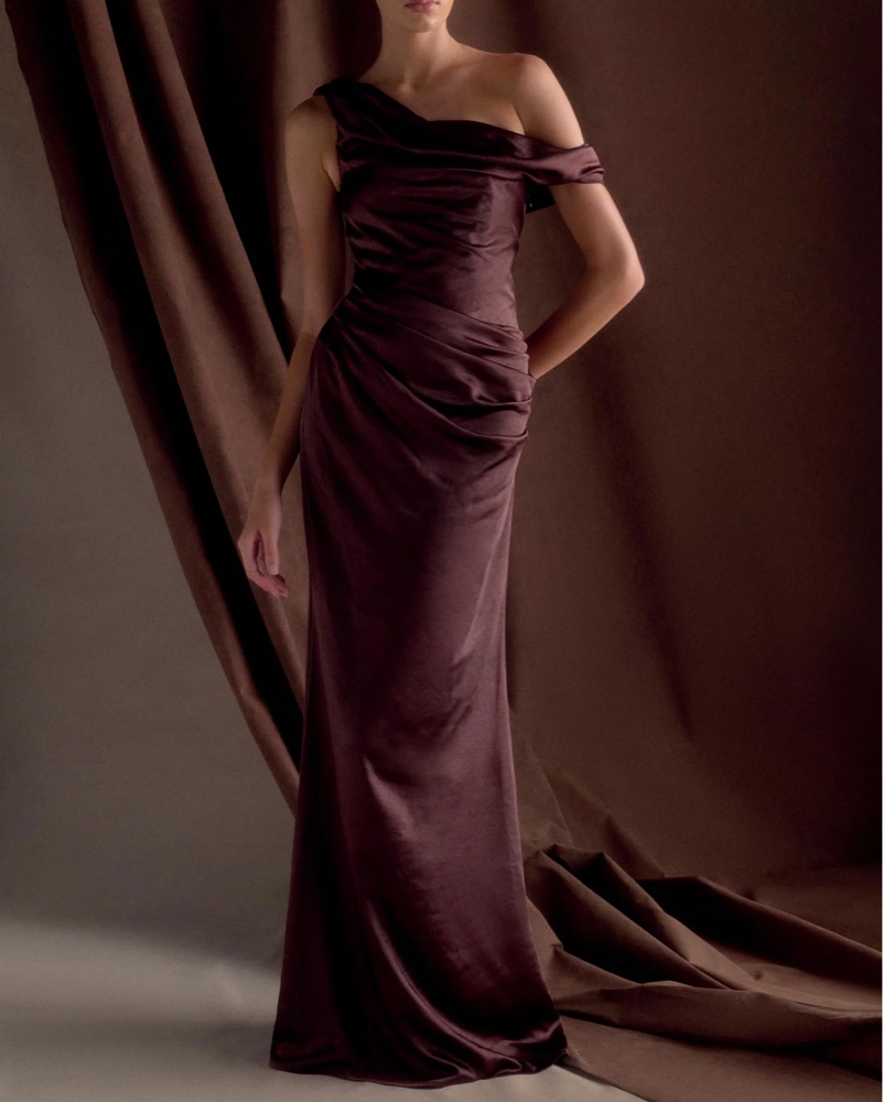 This luxurious satin dark chocolate gown is perfect for a formal occasion. I’m 5’4” and wearing 1.5” heels, dress is floor length for me as seen in pictures. Has built-in “corset”/structure so no bra needed and makes it extra comfortable and flattering.