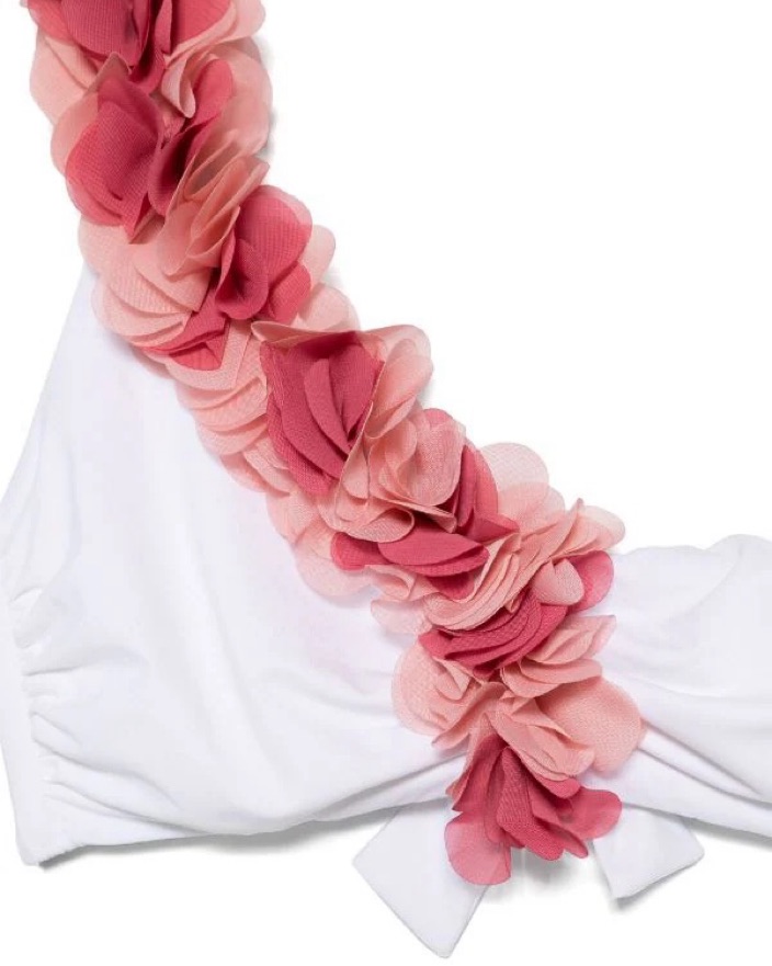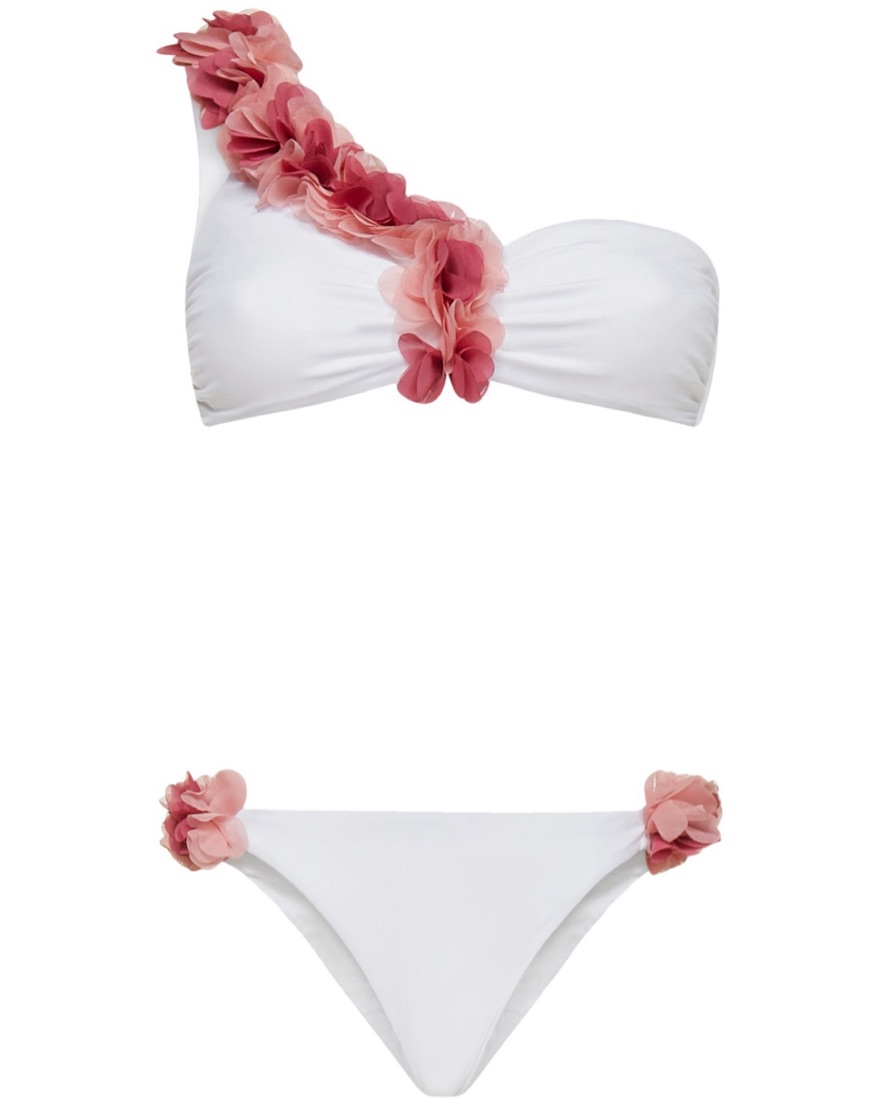 Fits XS/S. 80% polyamide, 20% elastane. Made in Italy. Hand wash. Unpadded top with boned sides. Back tie closure. Mesh floral trim. Sold as a set. NWT, never worn. Sold out everywhere.