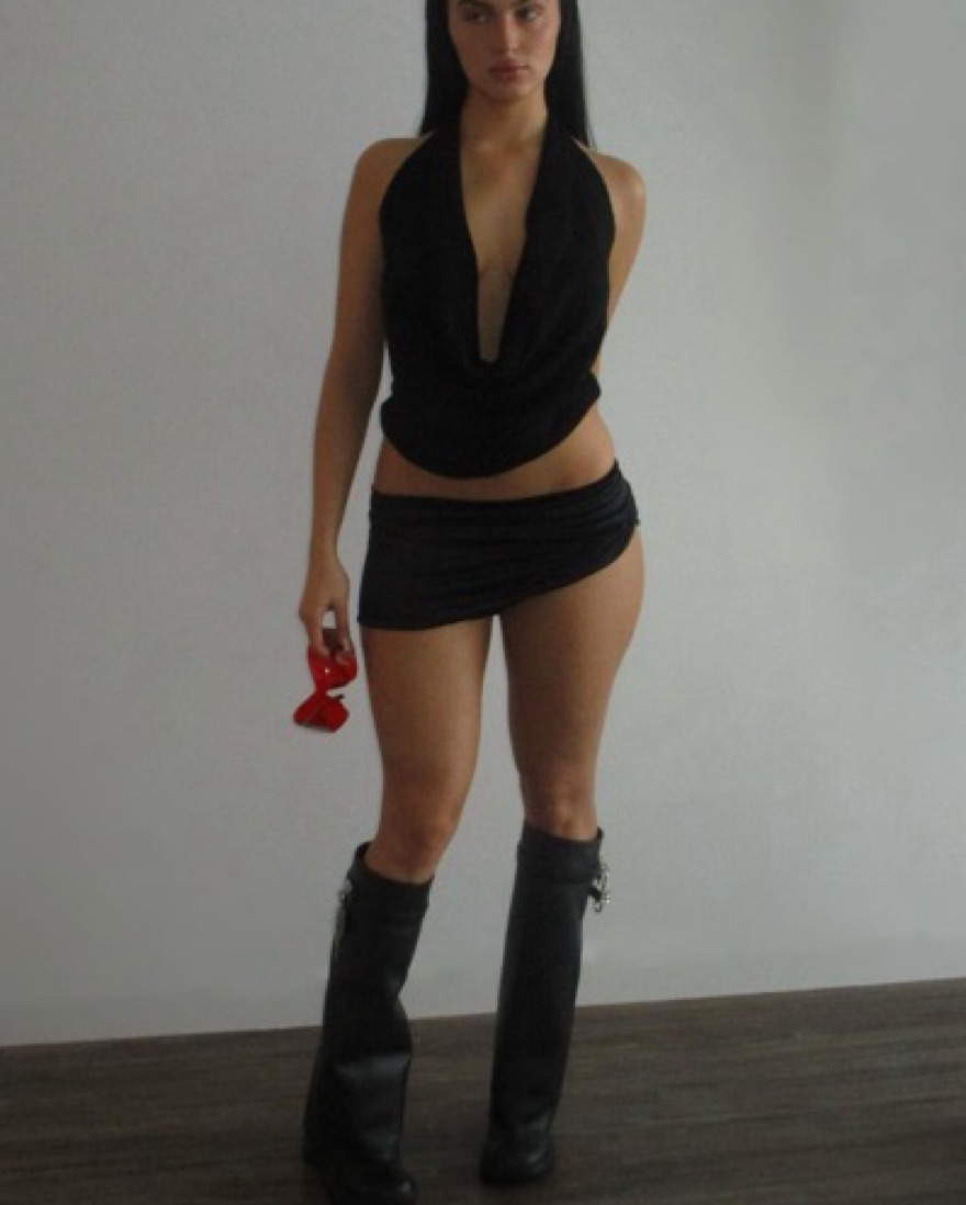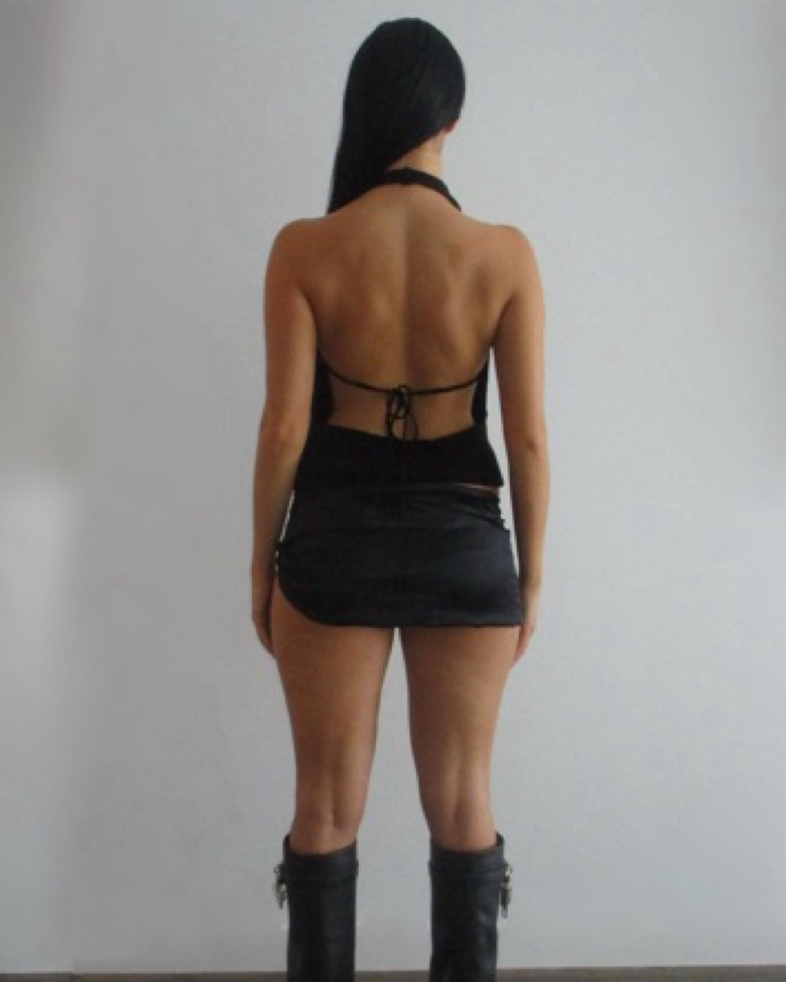 Knit, open back, plunge top. Can fit XS-M
