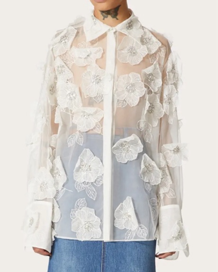 Gorgeous sheer floral white blouse. Bridal look, elevated work or party look!
