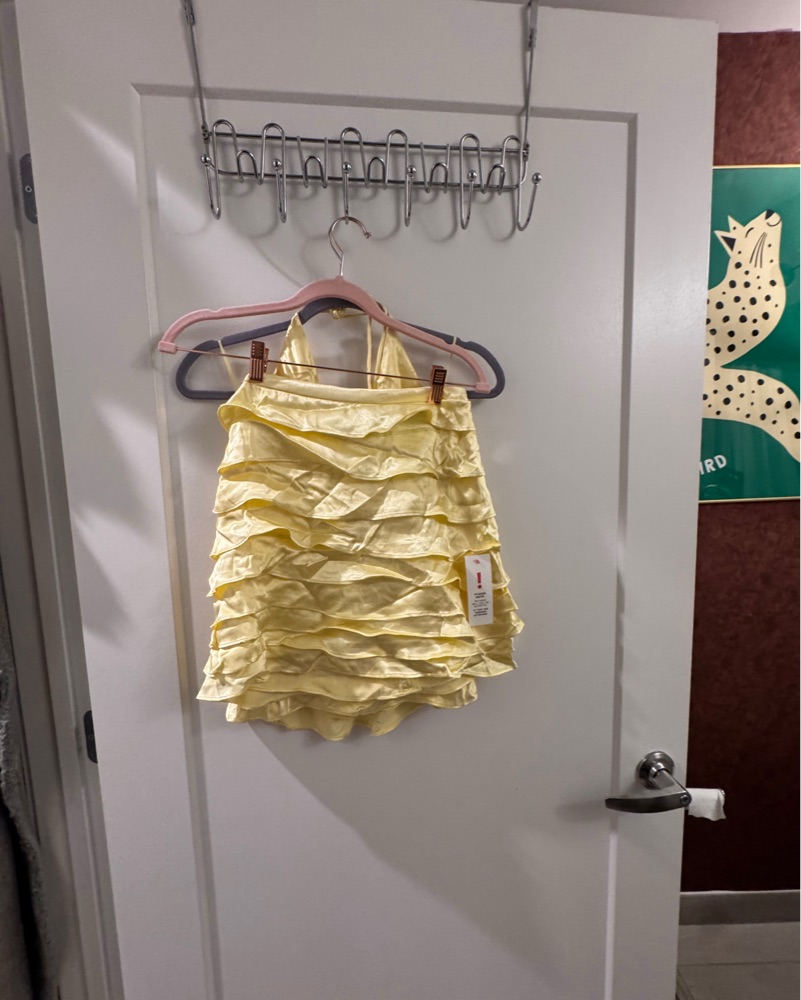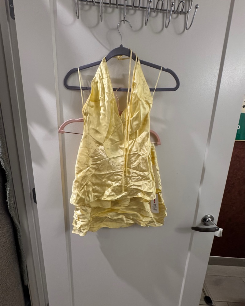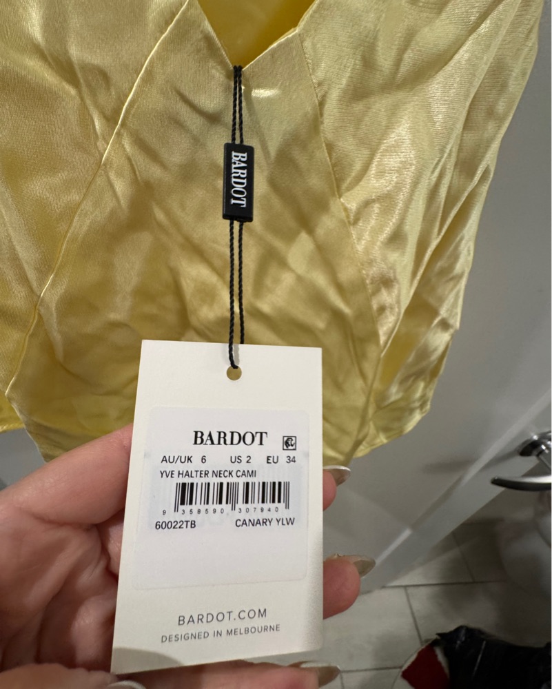 This stunning halter neck cami from Bardot is perfect for a summer evening event or special occasion. The vibrant canary yellow color and flirty ruffle details make it a chic and eye-catching choice. Comes w matching skirt !