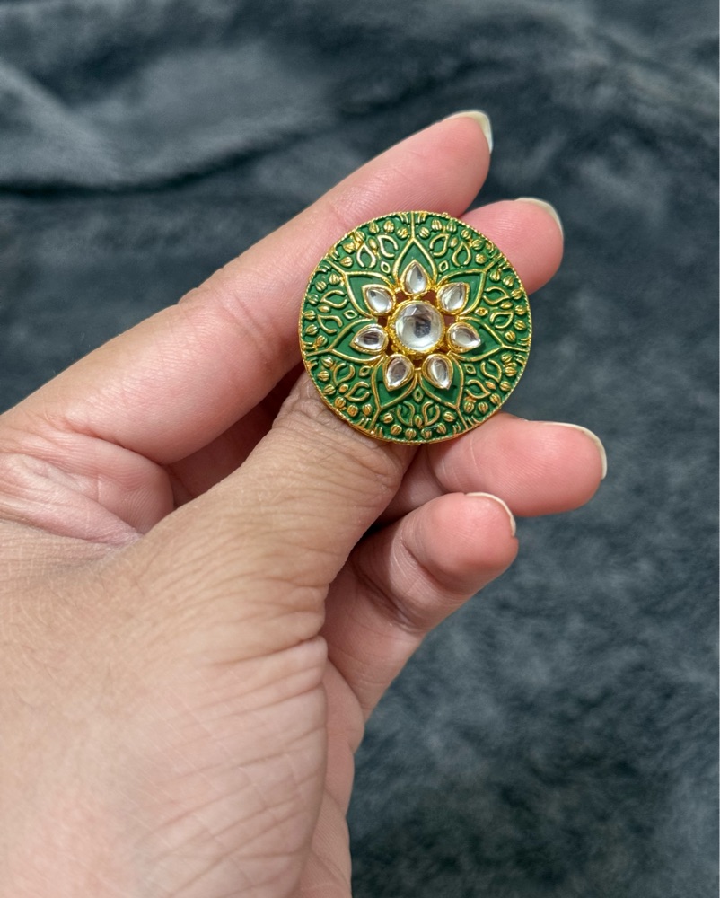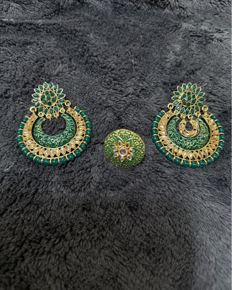 These exquisite earrings are a stunning blend of traditional craftsmanship and modern elegance. The intricate kundan work and vibrant emerald green hue make them the perfect accessory for any formal or festive occasion.