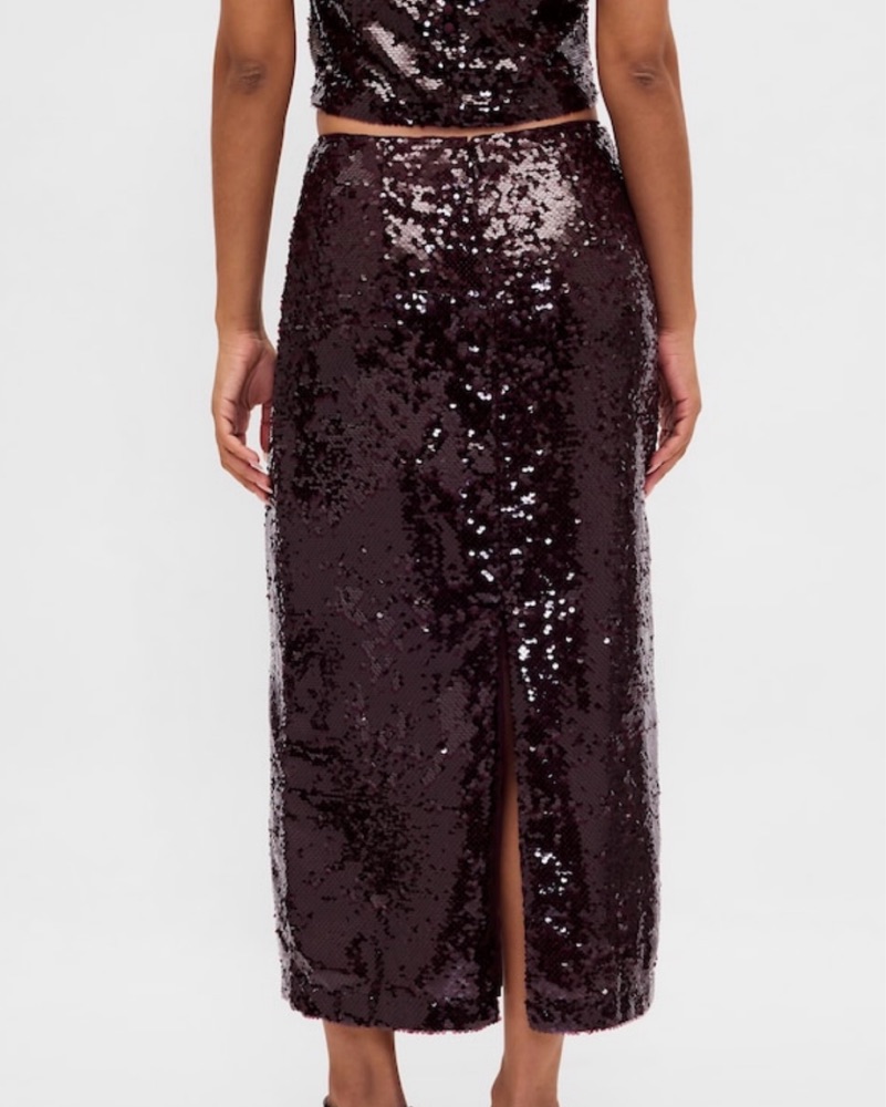 Burgundy sequin midi skirt, zips in the back, vent slit, mid-low rise, full lining so it’s not itchy!