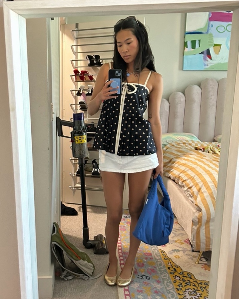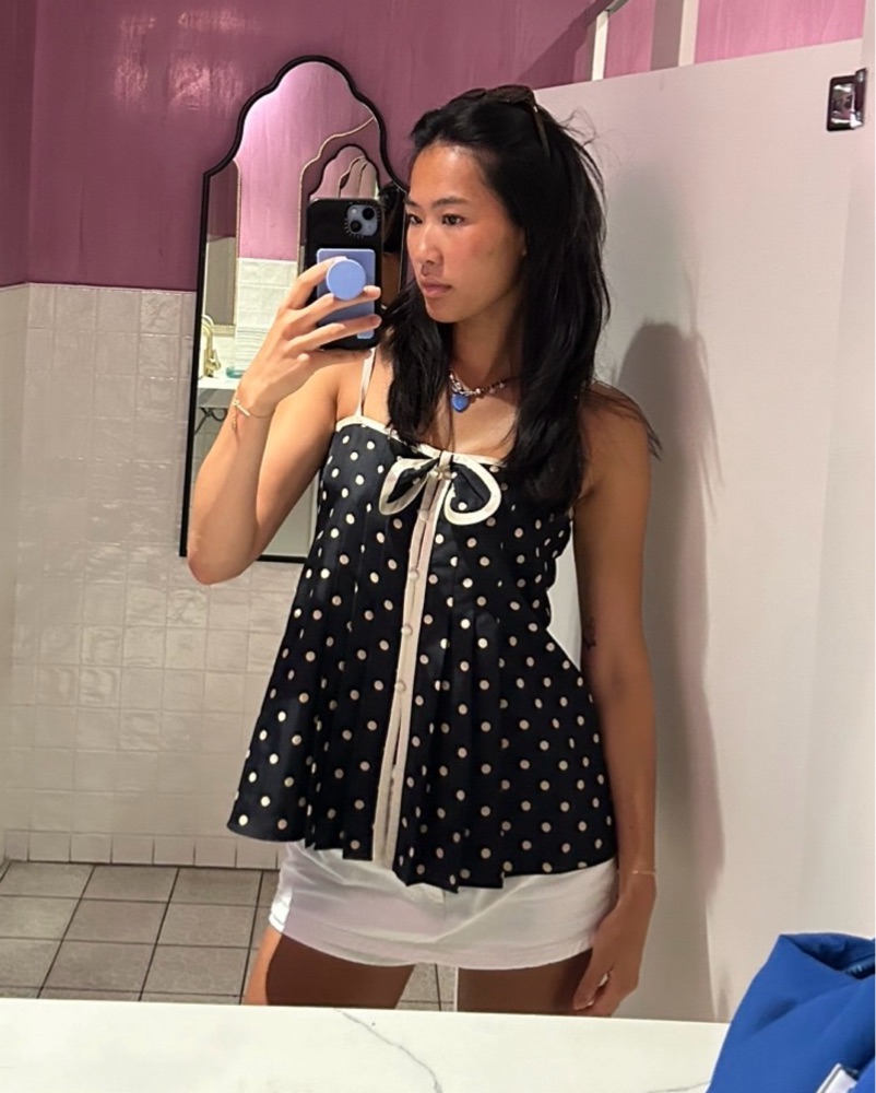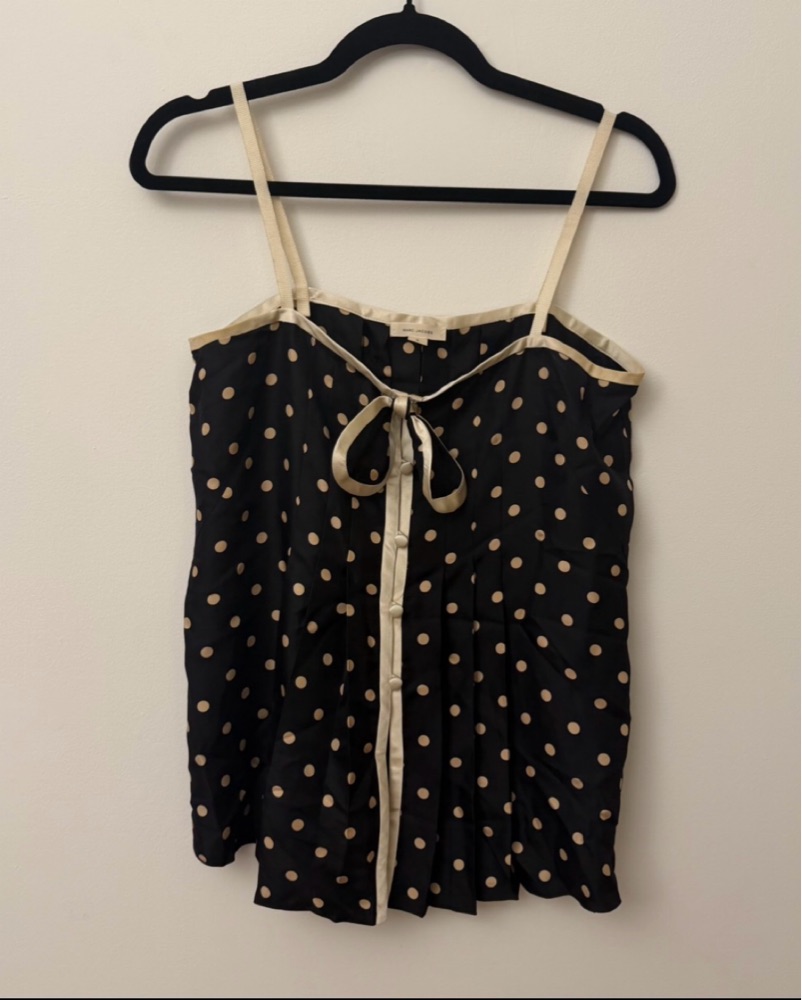 100% silk adorable vintage marc jacobs bow tank.i’ve worn this out during day/ night out. front clasp, pleats, cream and black polka dot. can fit S/M/4/6.