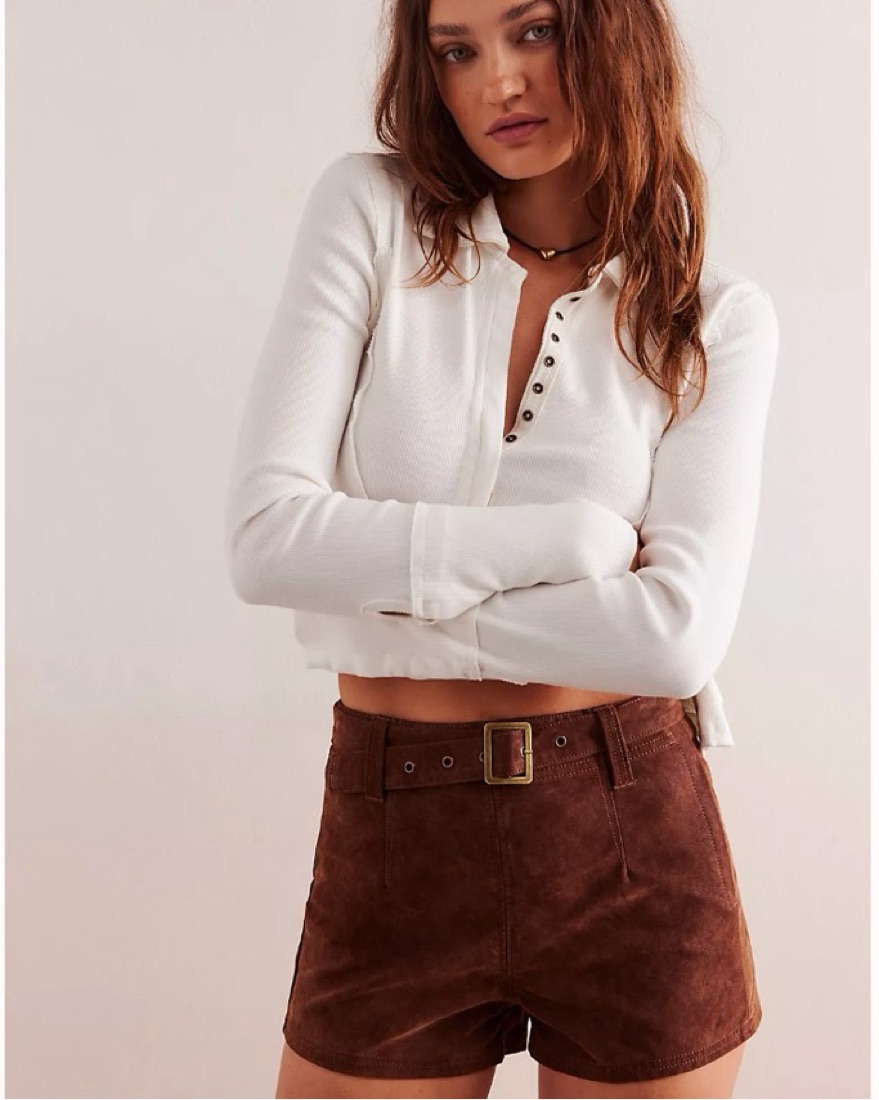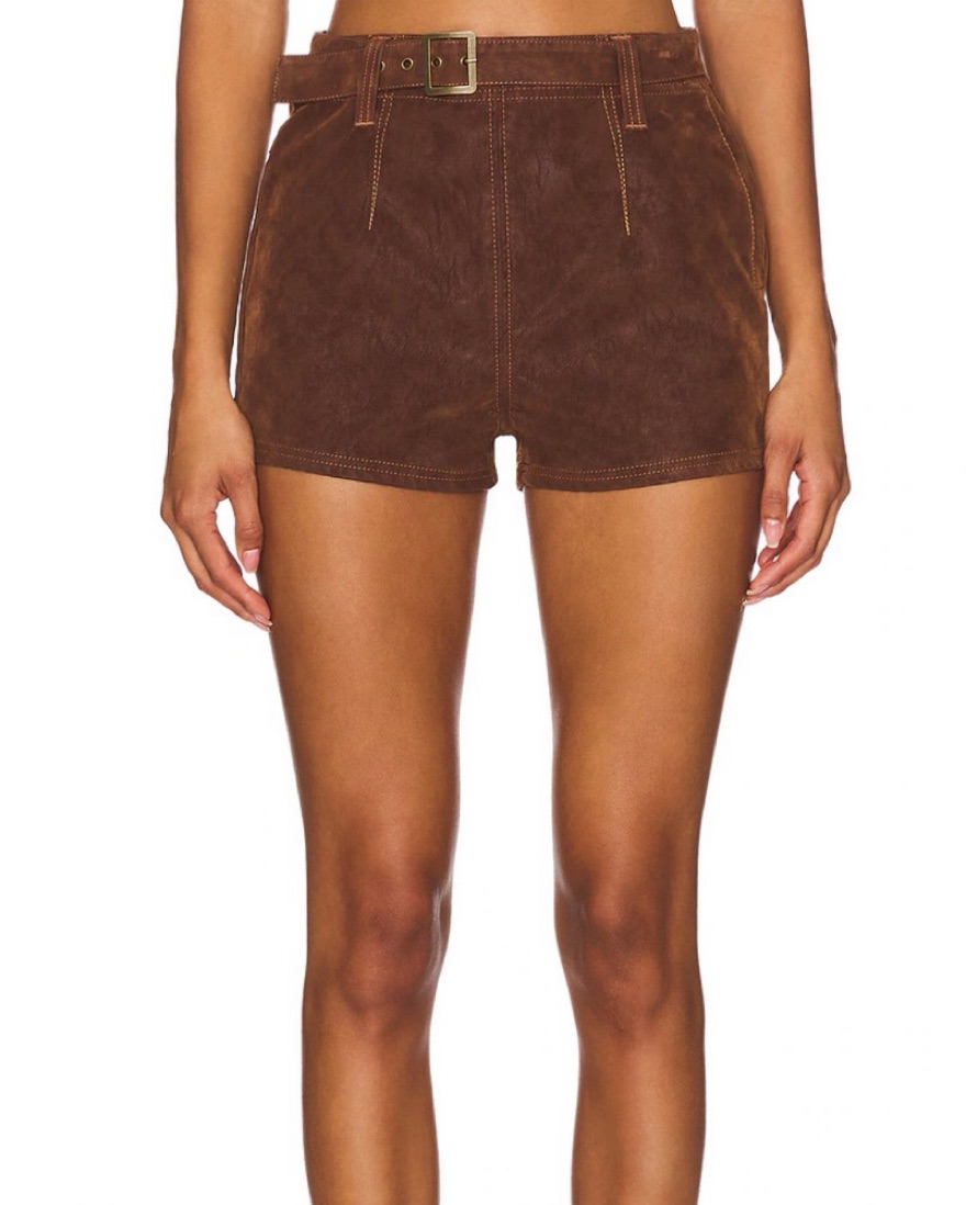 Brown Belted Suede Mini Shorts by Free People - Pickle