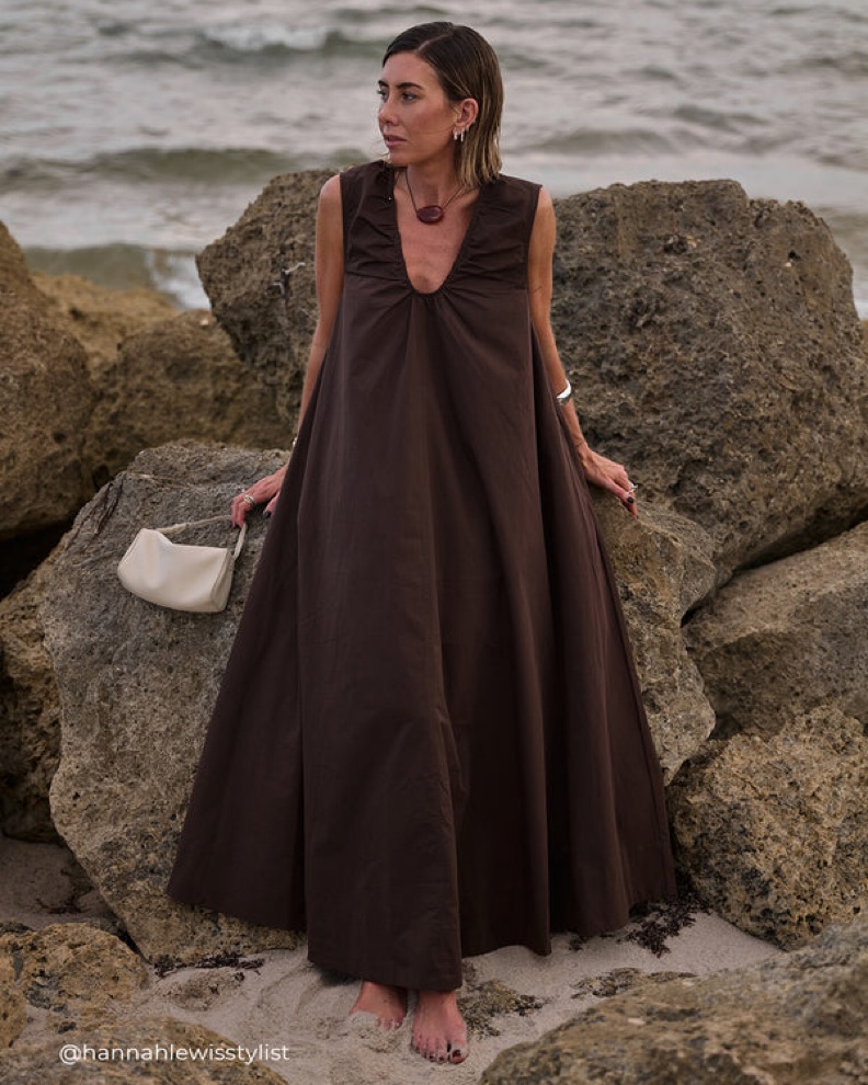 Size AU6/US2. Sleeveless cotton midi / maxi dress (depends on height). Bitter chocolate brown color. Great poplin quality