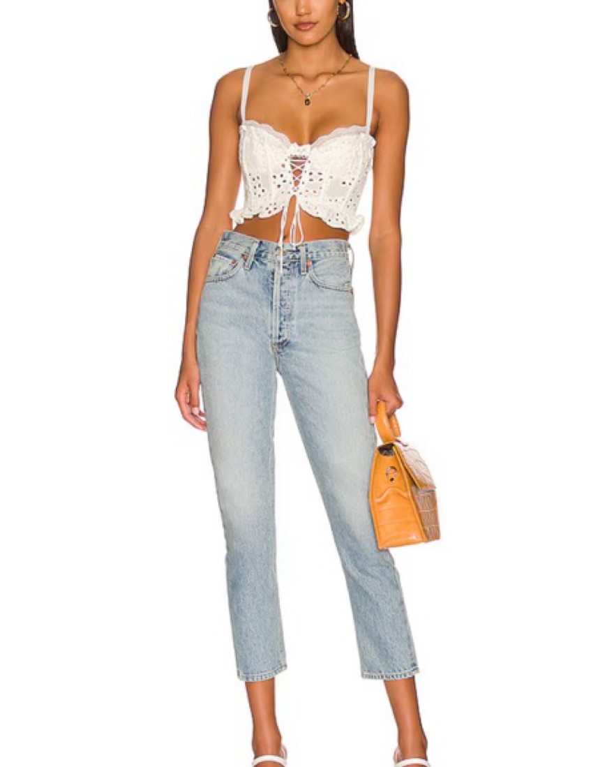 This stylish eyelet crop top adds a flirty touch to any outfit. Pair it with high-waisted jeans for a trendy, casual look. Runs a bit small.