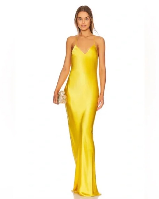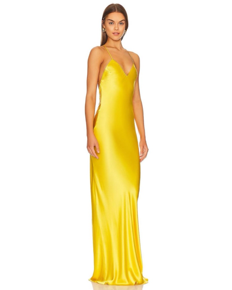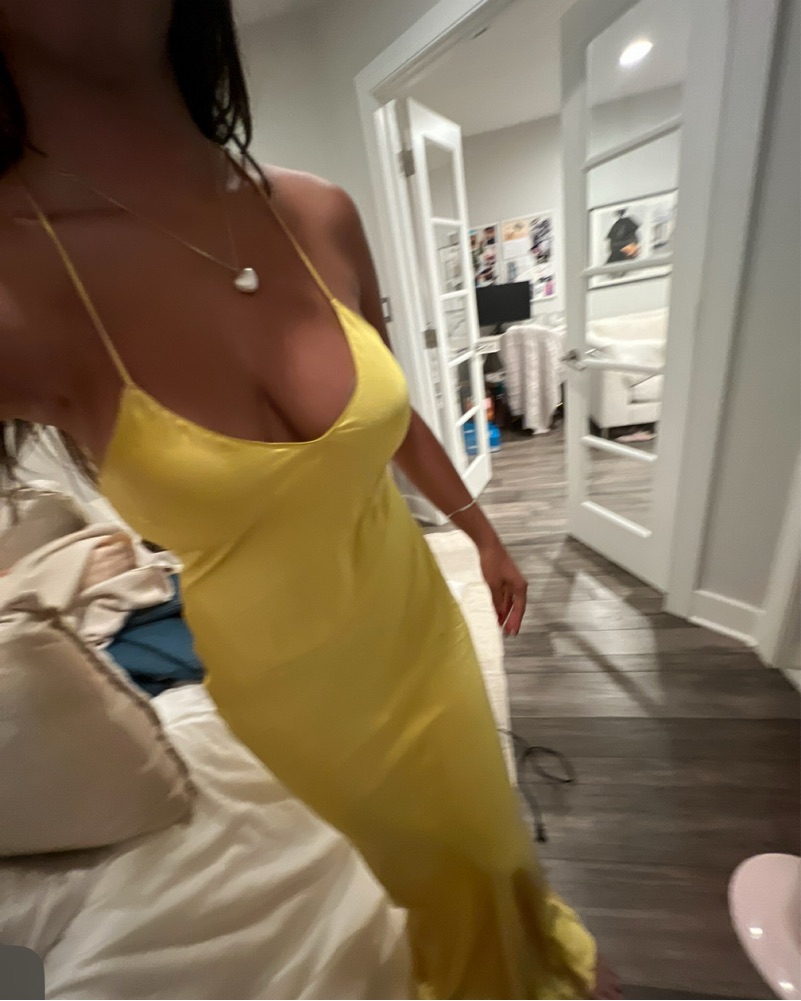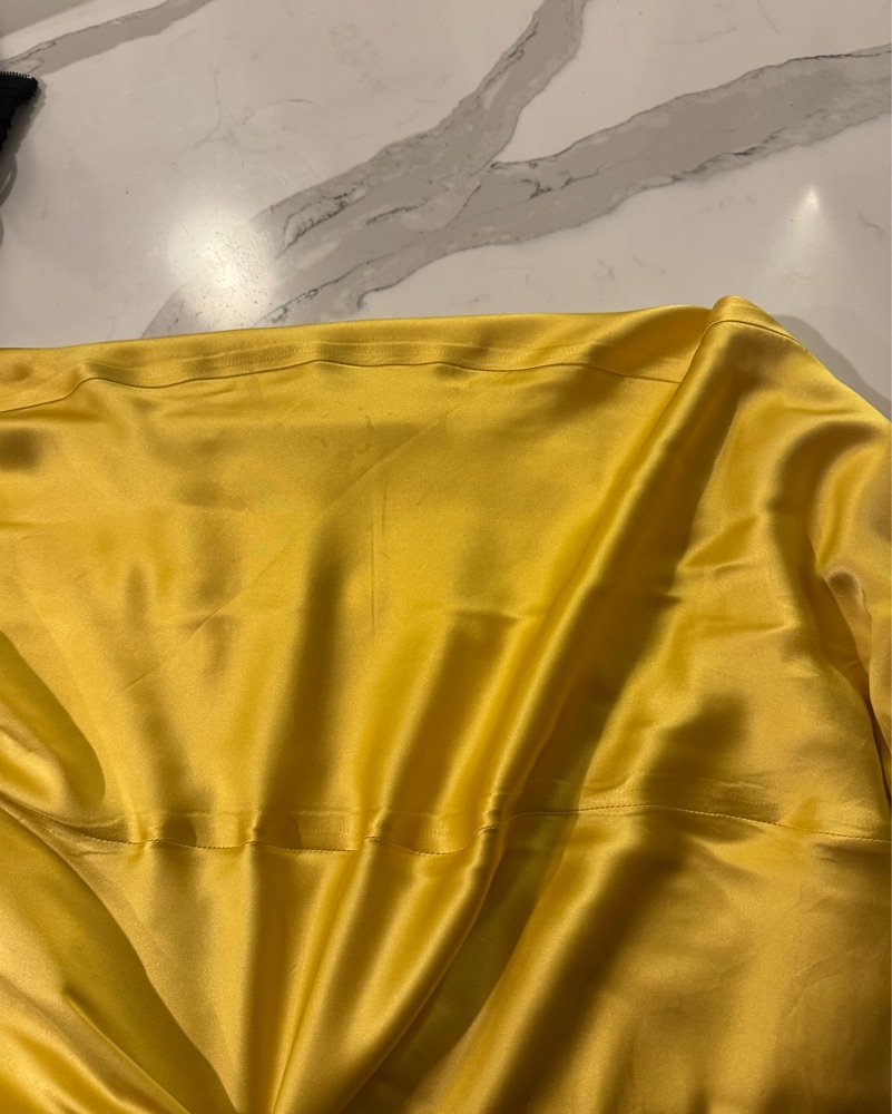 This stunning yellow satin gown is perfect for a formal event or special occasion. There is a very minor stain at the bottom of the dress, it’s not noticeable at all unless someone is like on their knees investing it, it’s perfect otherwise. Last photo shows the stain