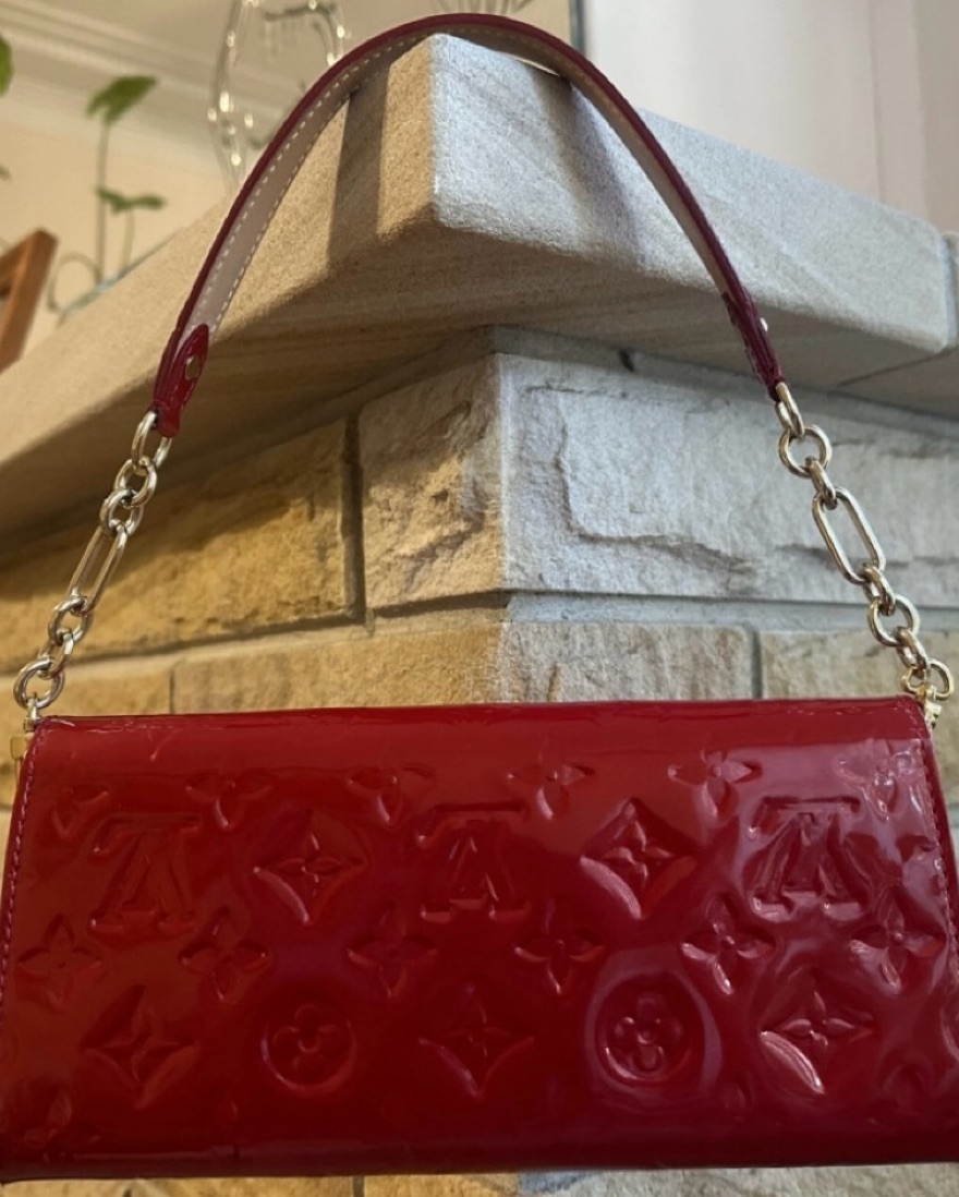 Sunset Boulevard Louis Vuitton in Red Patent Leather. It’s small fits about a phone and a wallet. Can take strap off and use as a clutch too. Please be very careful!!
