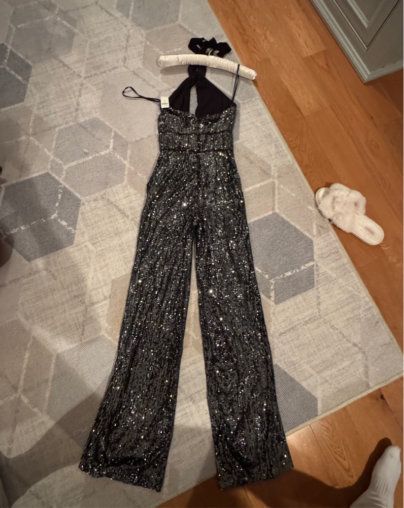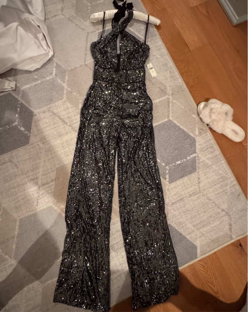 This stunning jumpsuit is perfect for a night out or a special occasion. The sequins give it a glitzy and eye-catching look. It has never been worn and comes new with tags. Size 00.