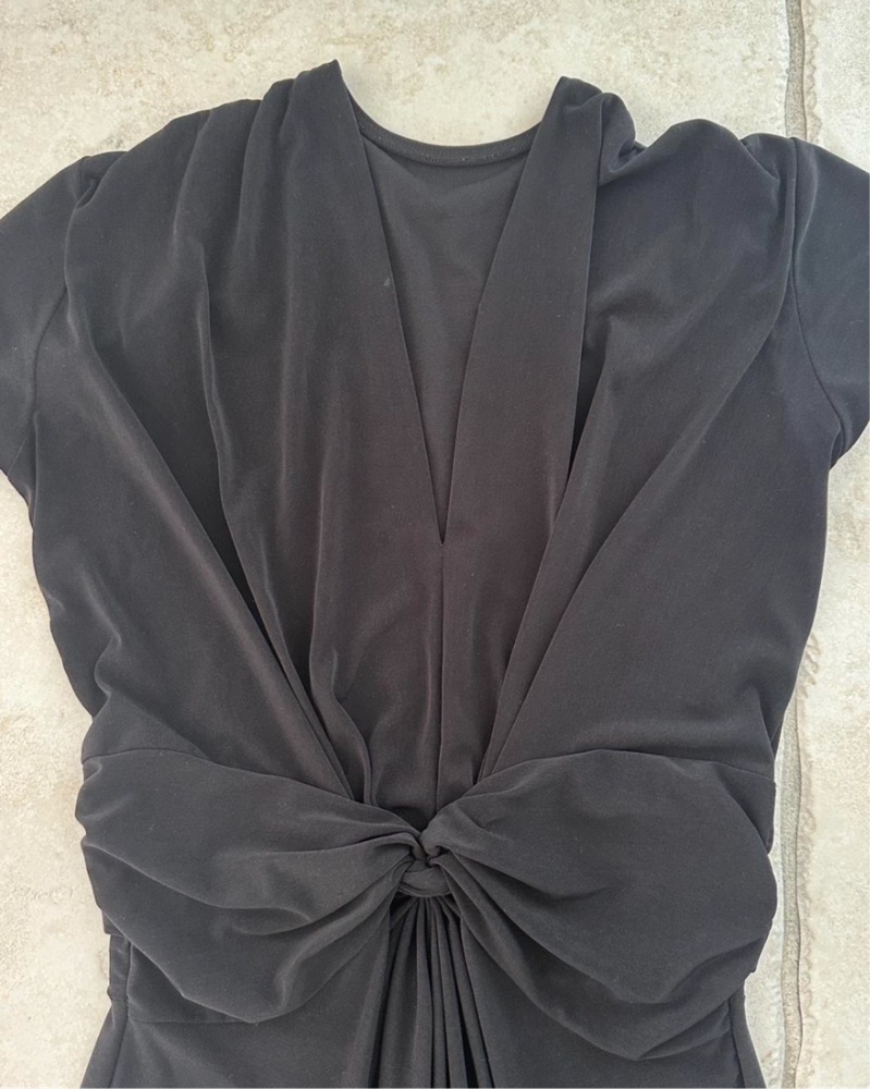 Black jumpsuit with front knot. Made in France, purchased at a local boutique. Easy wear, one sign fits all. Small sign of wear
