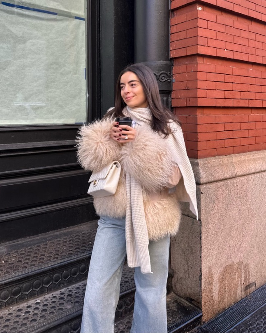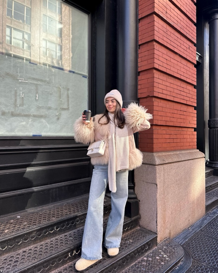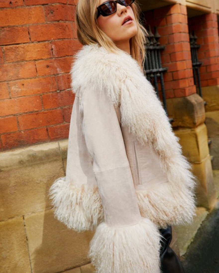 Renting my beige fur trim jacket mob wife trend in a size US4 from Nasty Gal, suede jacket with shearling collar cutest fluffy jacket, perfect for apres ski in Colorado, telluride Aspen Jackson hole park city ski outfit