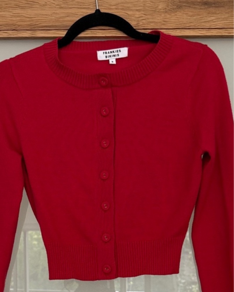Frankies Bikinis red marialla cloud knit skirt and cardigan in color burning love. SO CUTE for fall with boots. Skirt and cardigan are both size medium but run VERY small, I am a small in everything and these both fit well.