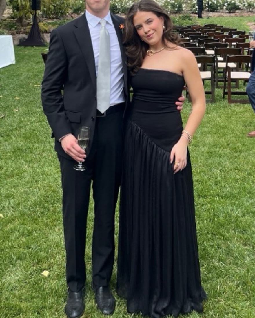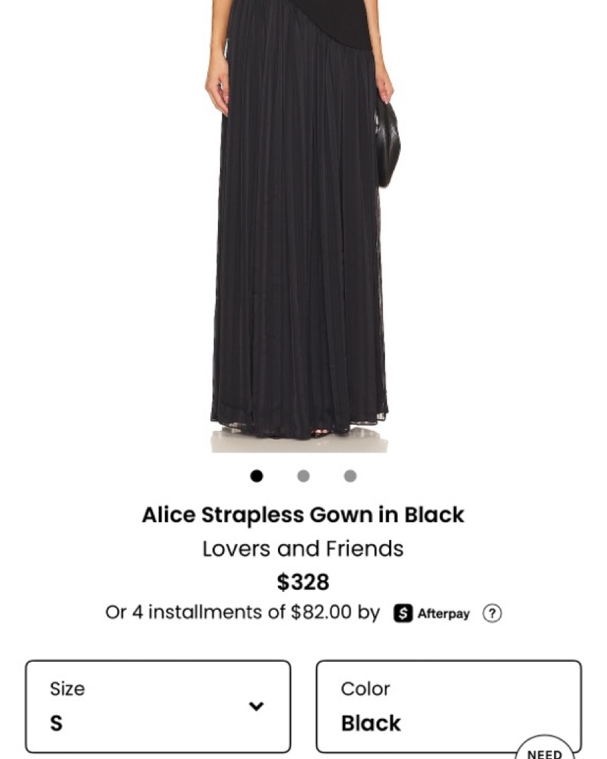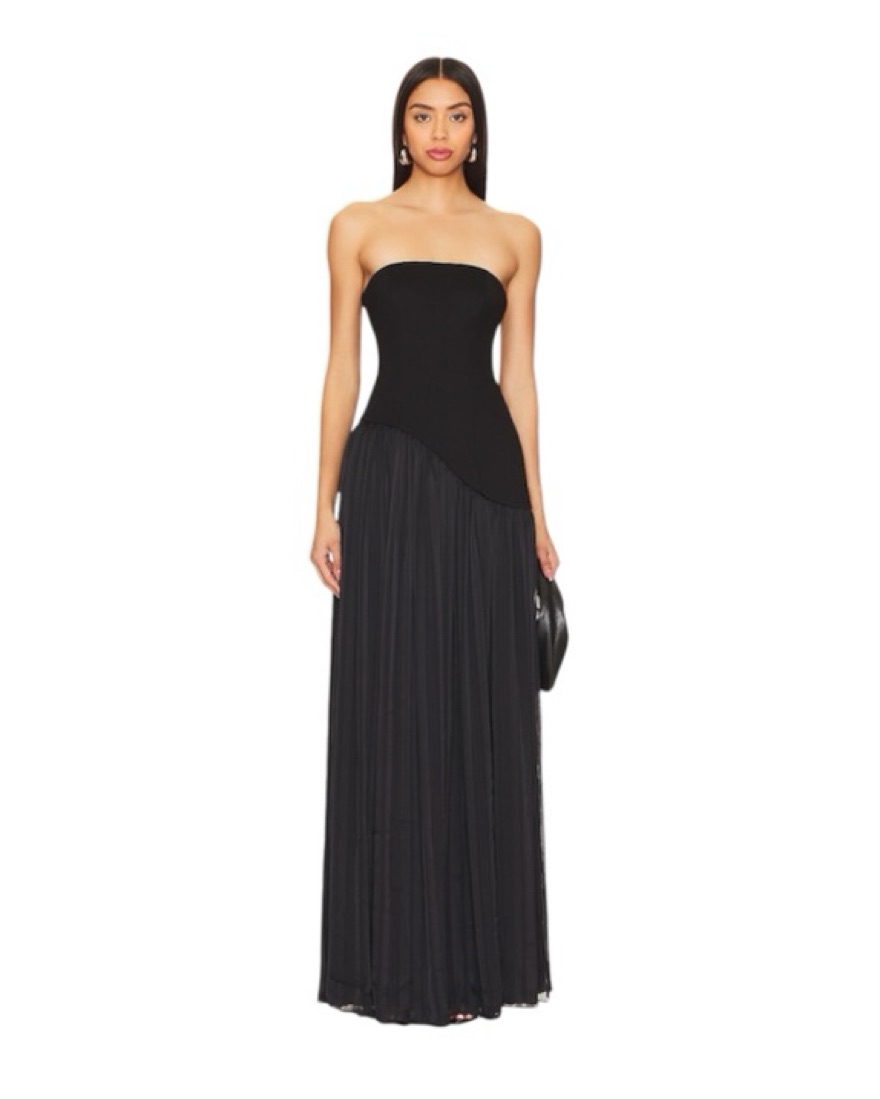 Strapless black formal dress from Lovers and Friends. I wore it for a wedding and got so many compliments on it! I did it get hemmed about 2 inches because I am 5’3 and it was way too long. See images of me in the dress for reference.