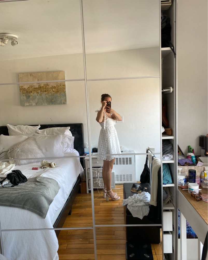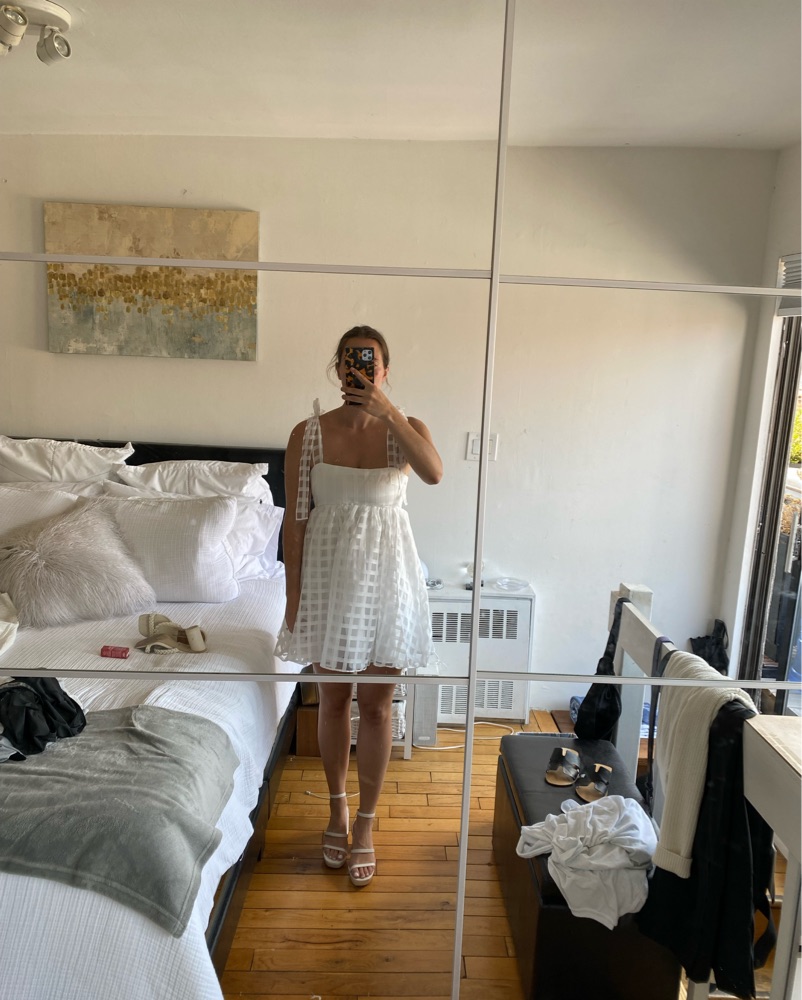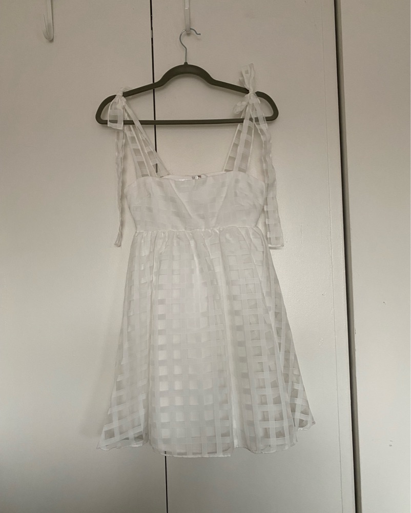 This chic white mini dress features a fun checkered pattern, perfect for a summer day or evening out.