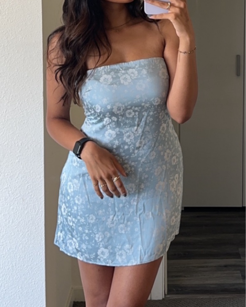 super cute blue strapless dress - has a bra lining up top to stay up