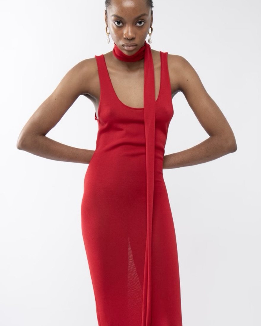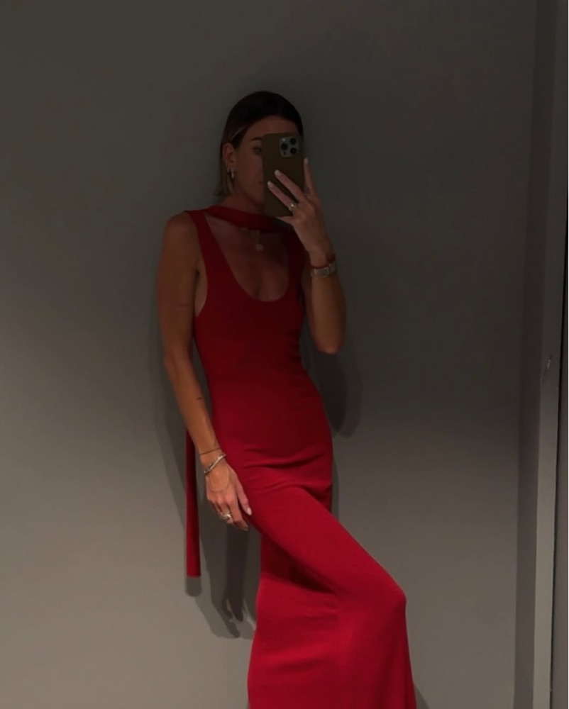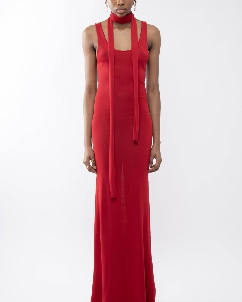 The perfect red dress!! Not sold on the website anymore. Matching scarf included. Fitted and breathable red maxi dress :). Perfect wedding guest, date night, dinner or holiday dress.