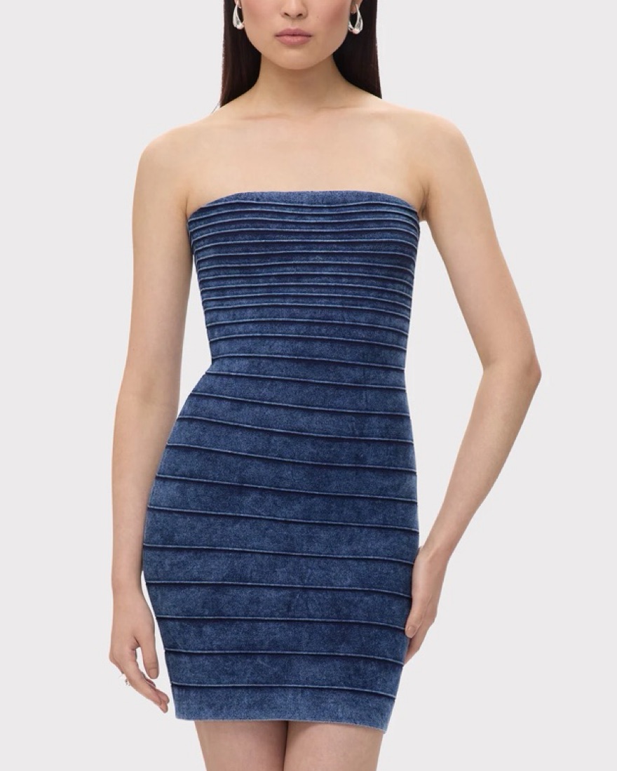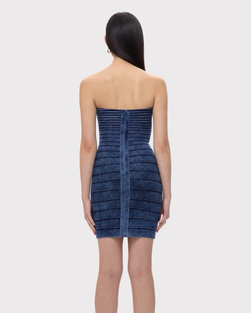 This chic denim effect dress features a classic strapless silhouette and a pleated, body-hugging design that flatters the figure. Perfect for a night out or a special occasion.