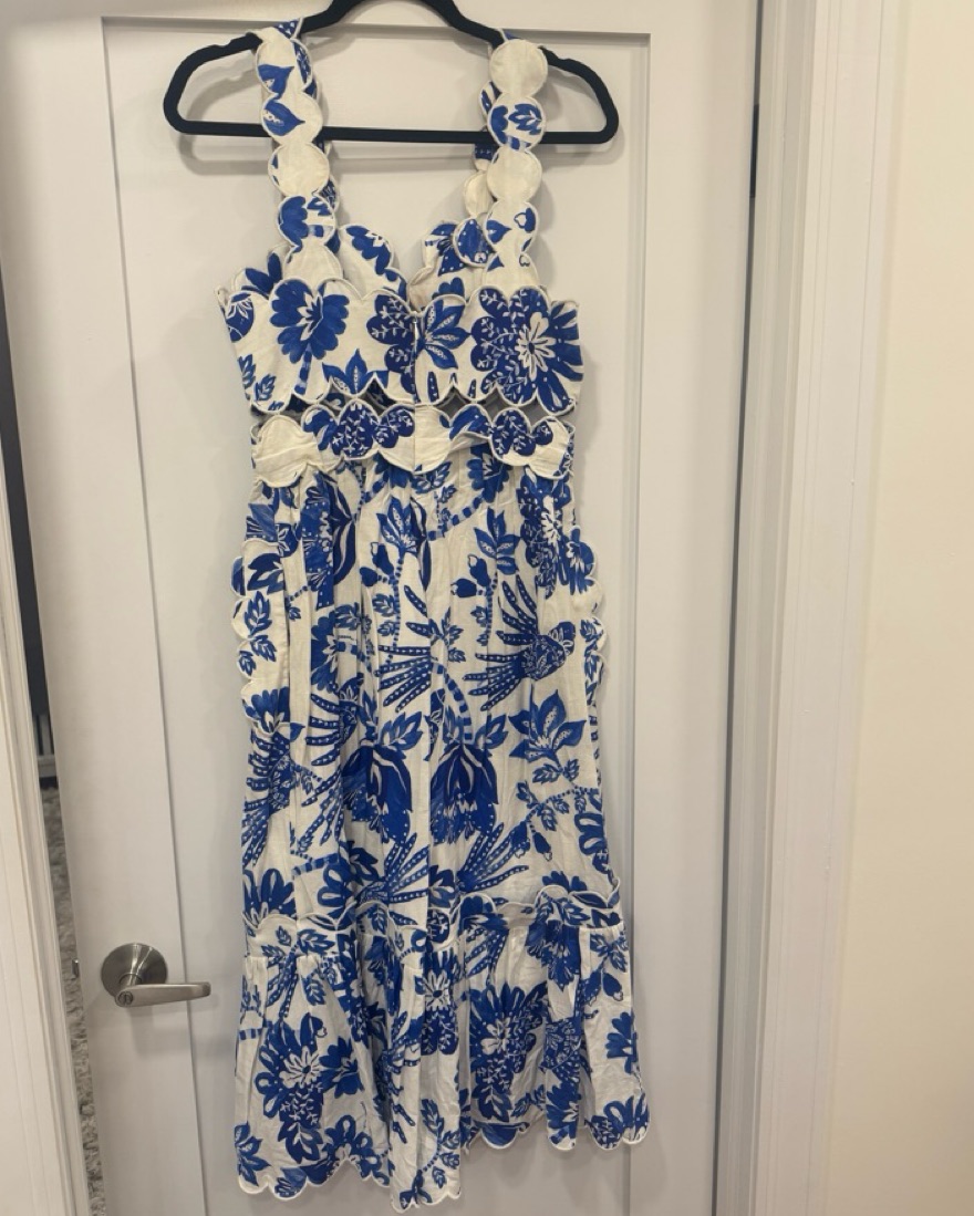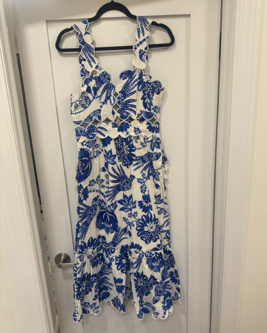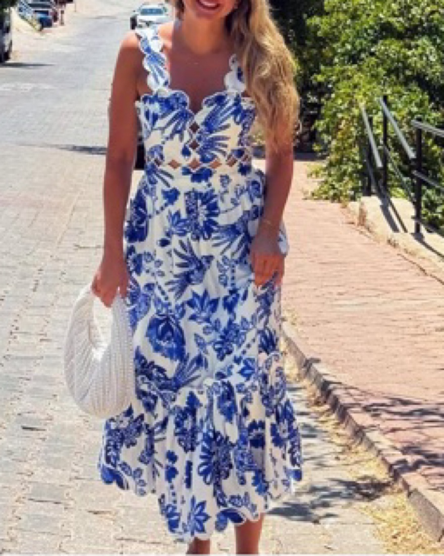 This scalloped stunning blue and white floral midi dress is perfect for a summer garden party or beach vacation. Has pockets !