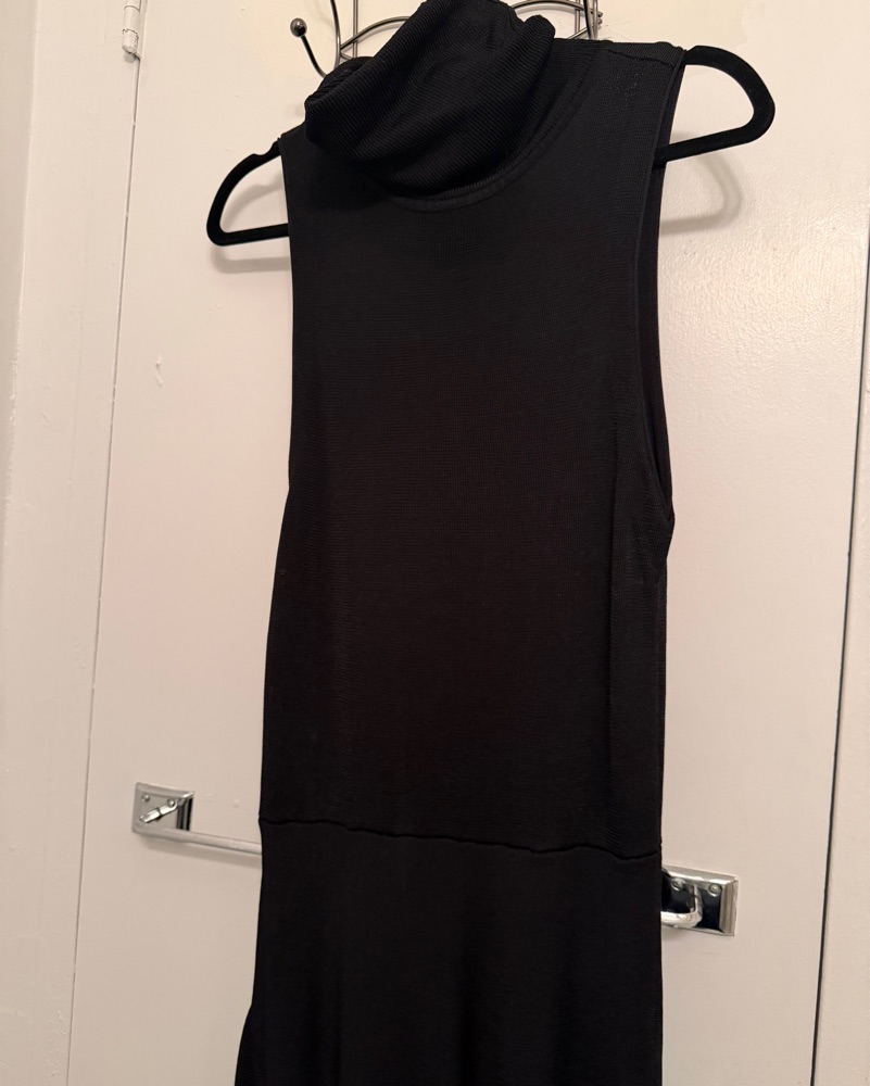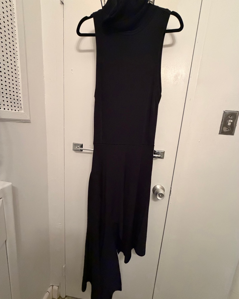 This versatile black asymmetrical dress is perfect for a night out or special event. The cowl neck and draped silhouette create a flattering and elegant look.