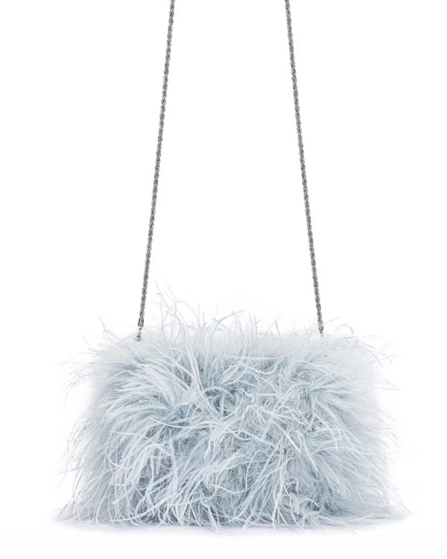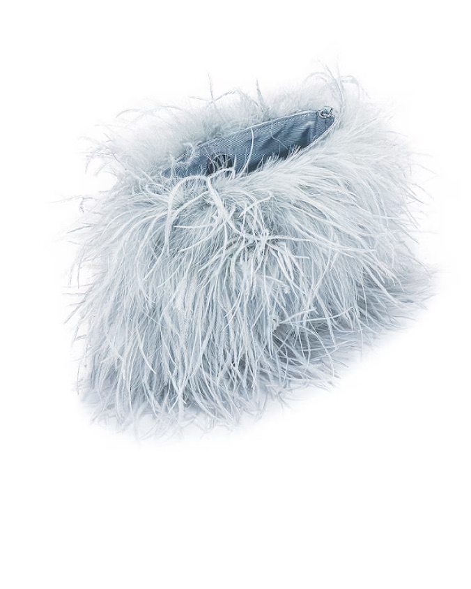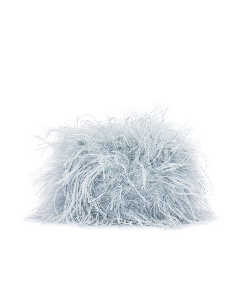 Ice blue zahara pouch with feathery exterior. Magnetic button top closure. Single compartment. Detachable shoulder strap.