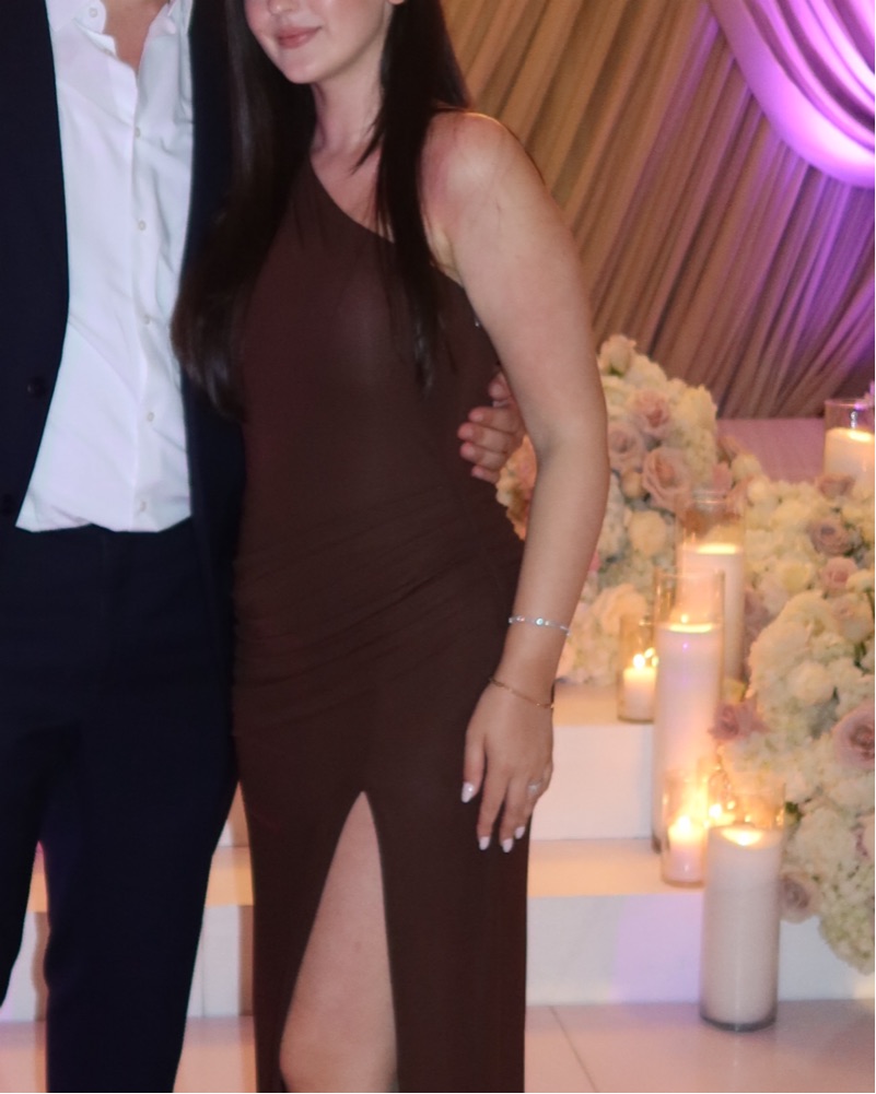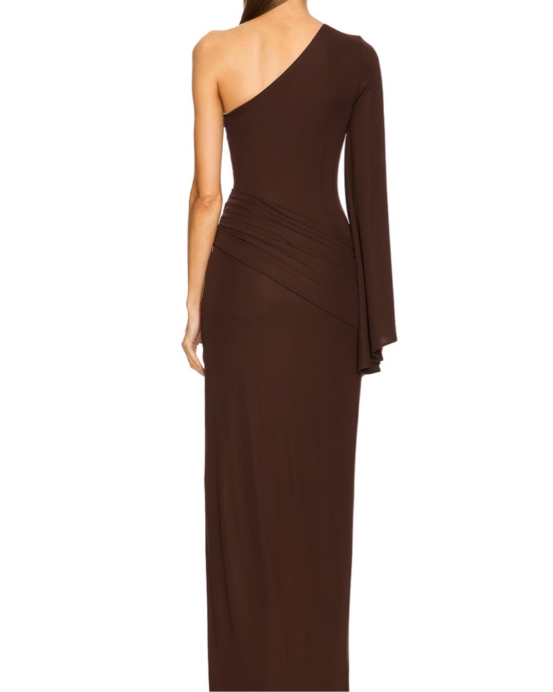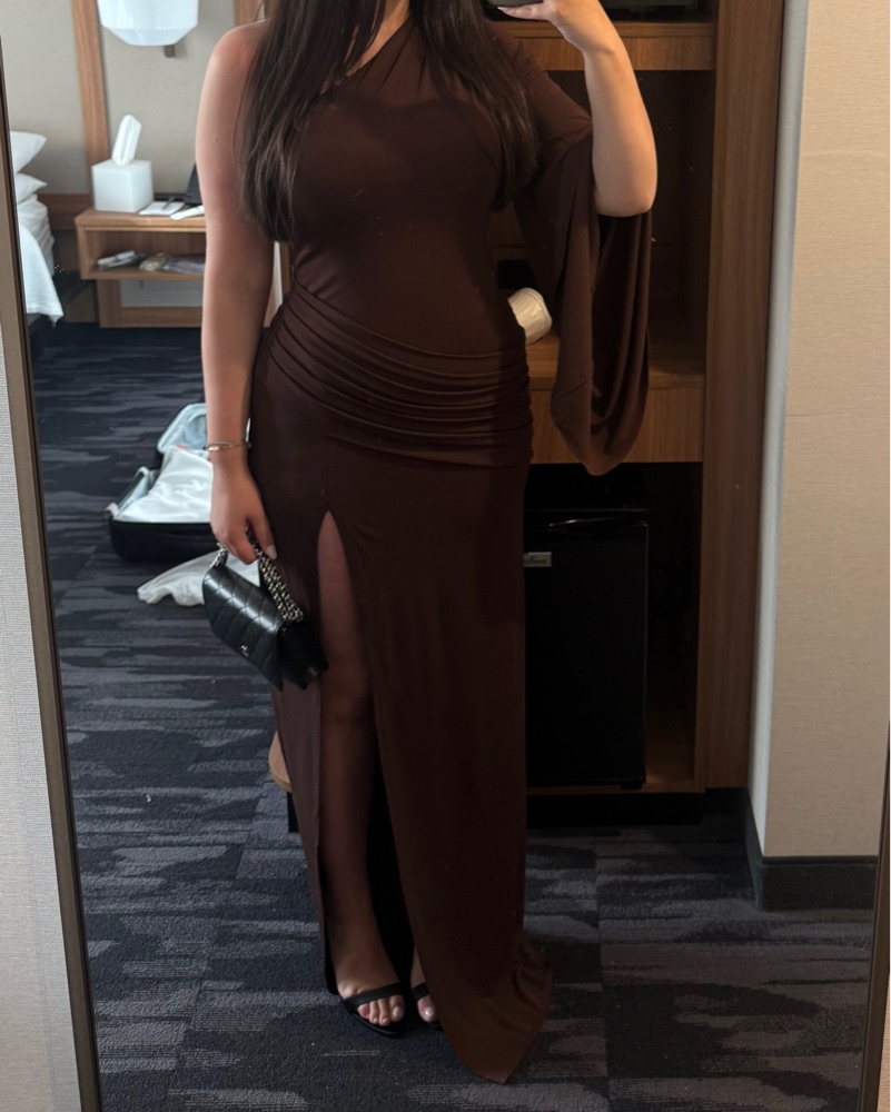 This stunning one-shoulder dress is perfect for a formal event or wedding guest dress. The ruched detailing and thigh-high slit create a sultry yet sophisticated look. Perfect for fall wedding guests dress.
