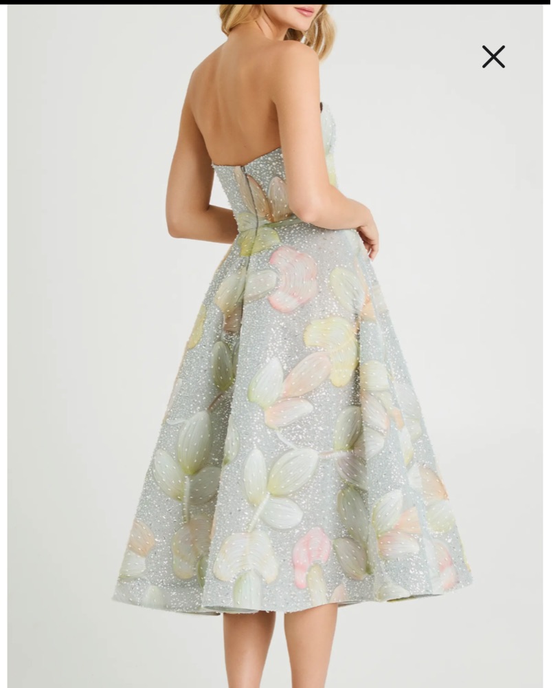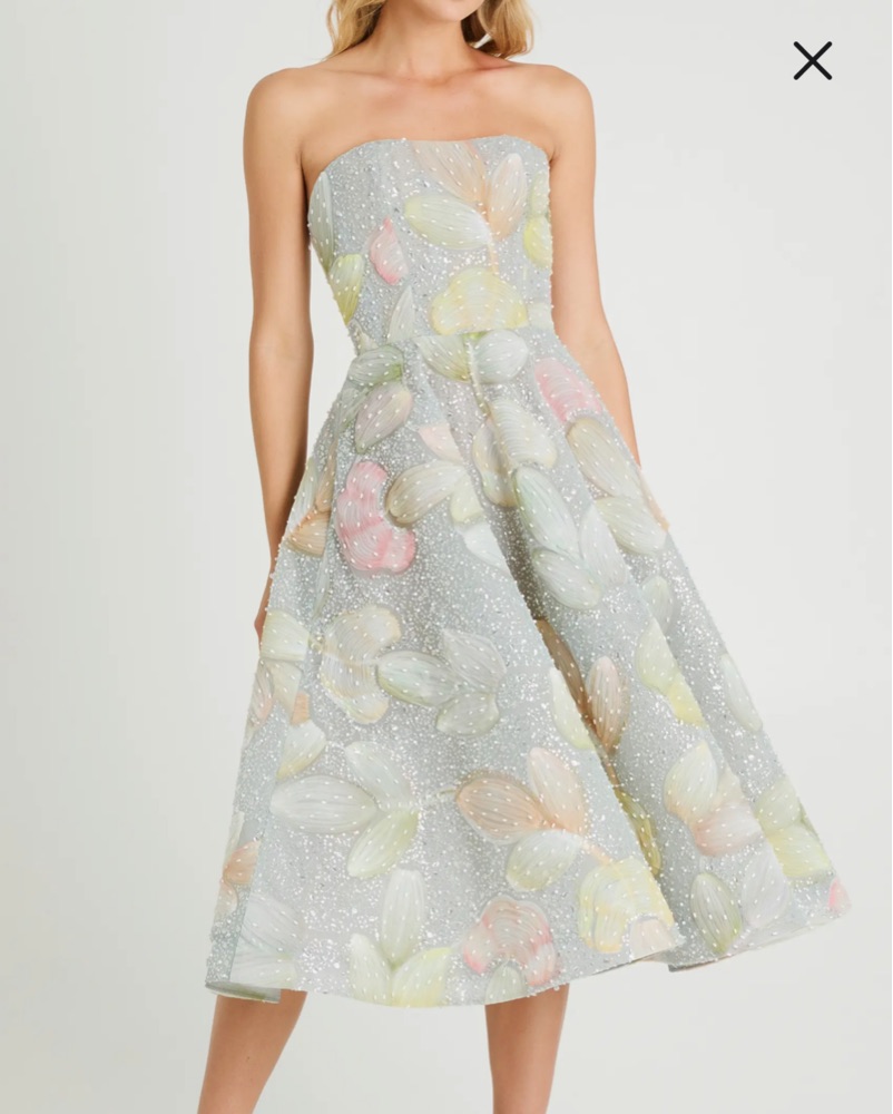 Absolutely STUNNING dress. I have never received so many compliments! Lustrous embellishments add texture and dimension to this shoulder-showing flared dress covered in brushstroked petals.