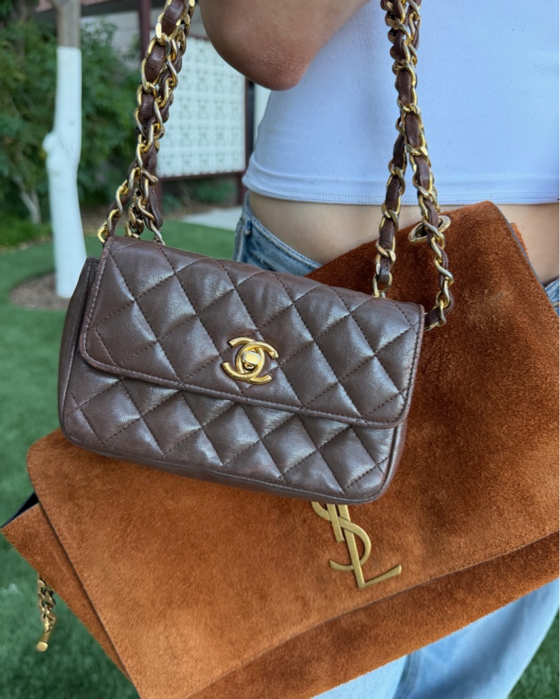 Chanel Mini Classic Flap in rich mocha brown lambskin with 24k gold plated hardware. True mini size that doesnt fit a phone, meant as a chic statement accessory. Perfect for dinners, events, or layering with a larger bag. Beautiful exterior with interior rubbing thats not visible when wearing