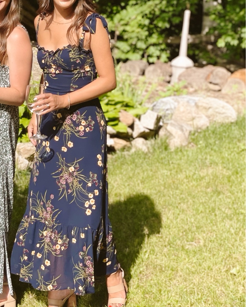 Beautiful and so flattering on. Adjustable straps. I am 5’1 the dress was not hemmed and it hit at my ankles