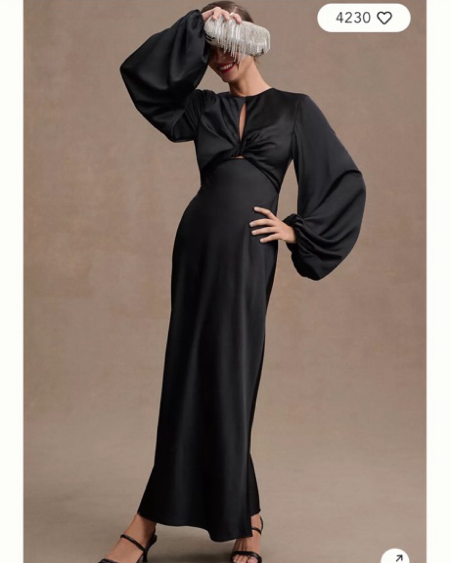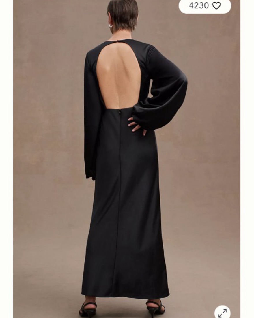 Dress is in brown. Backless. Full-length balloon sleeves. I’m 5’9 so dress will likely be full length if shorter!