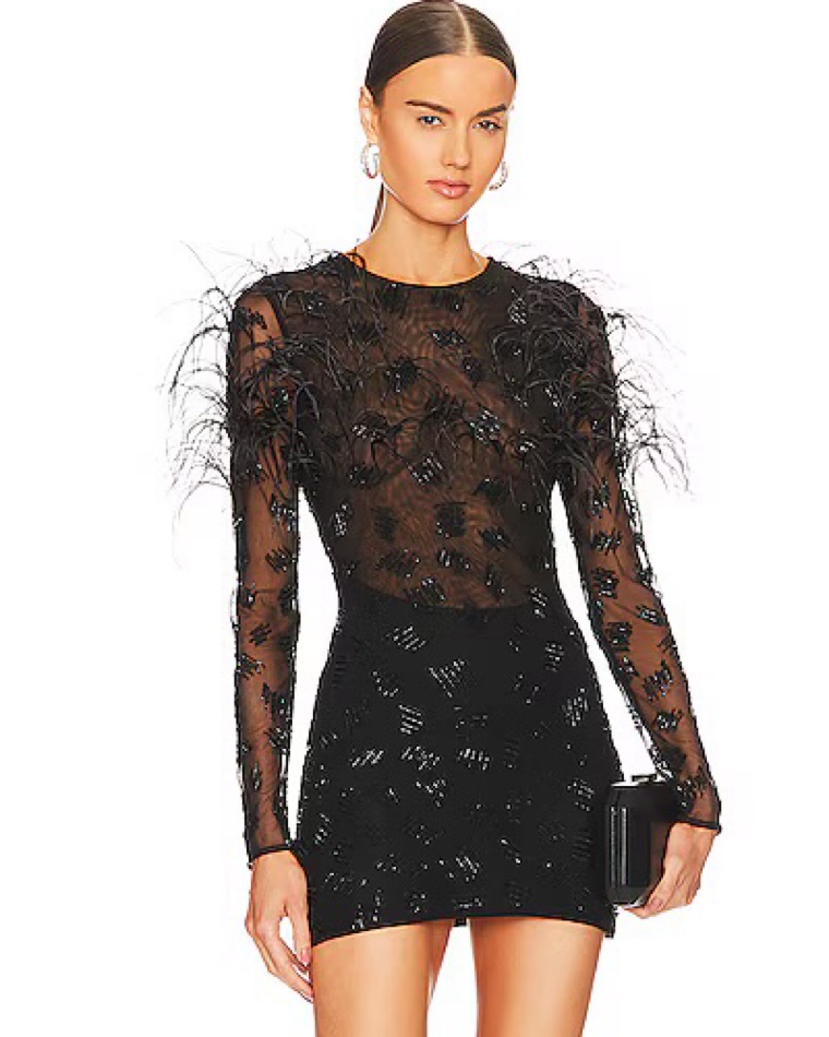 This stunning Kendra Feather Dress is perfect for a glamorous night out. The intricate feather detailing and form-fitting silhouette create a truly captivating look.