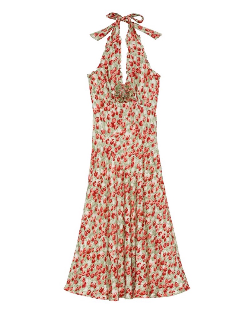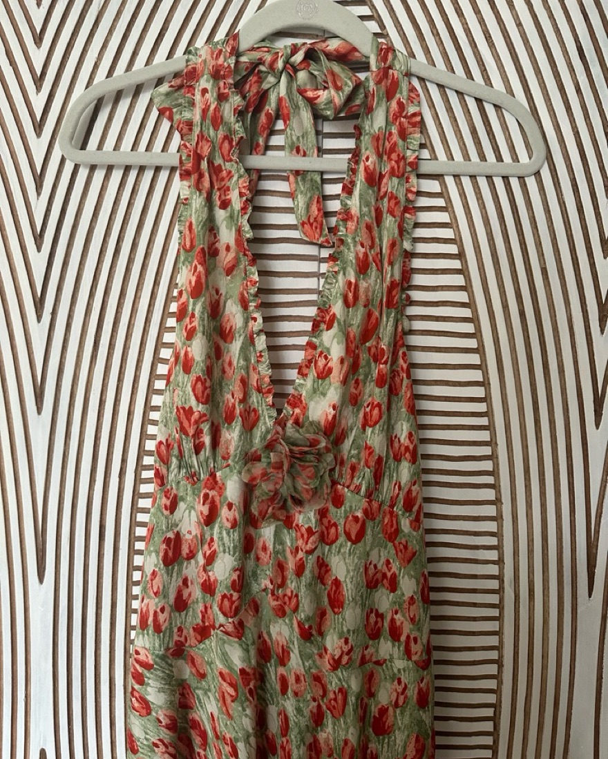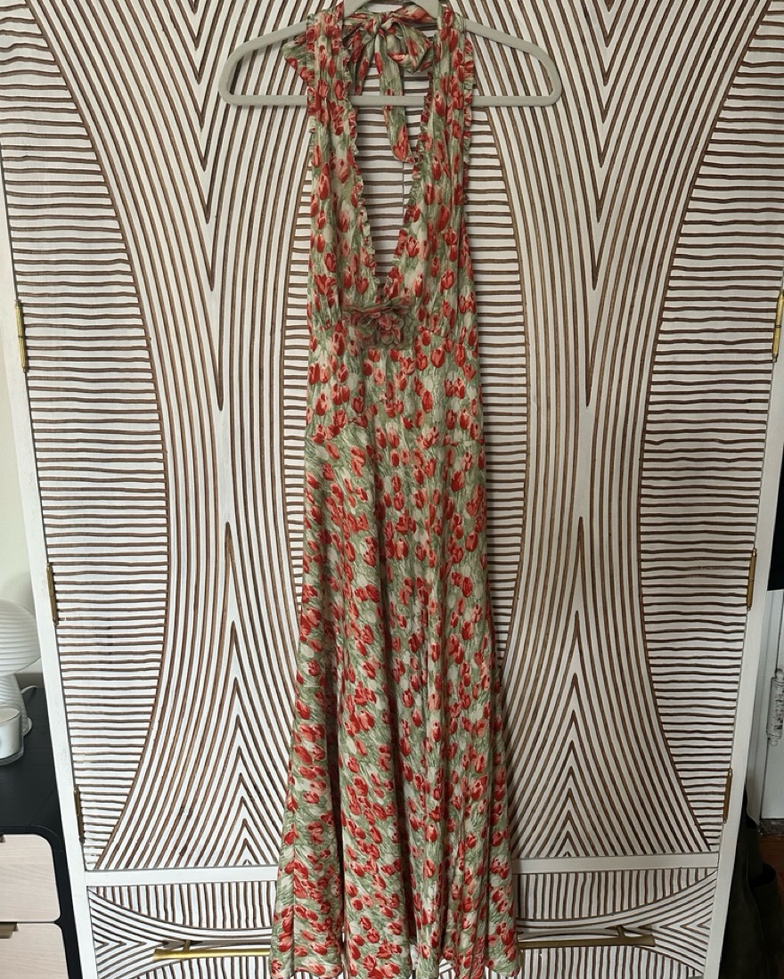 Tulip print halter dress - the dry cleaner broke the flower pin so the dress no longer has the flower in the center (pictured without the flower in the photo of me wearing it).