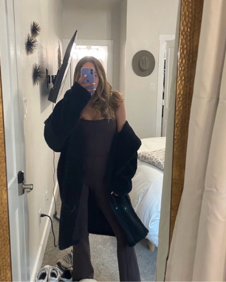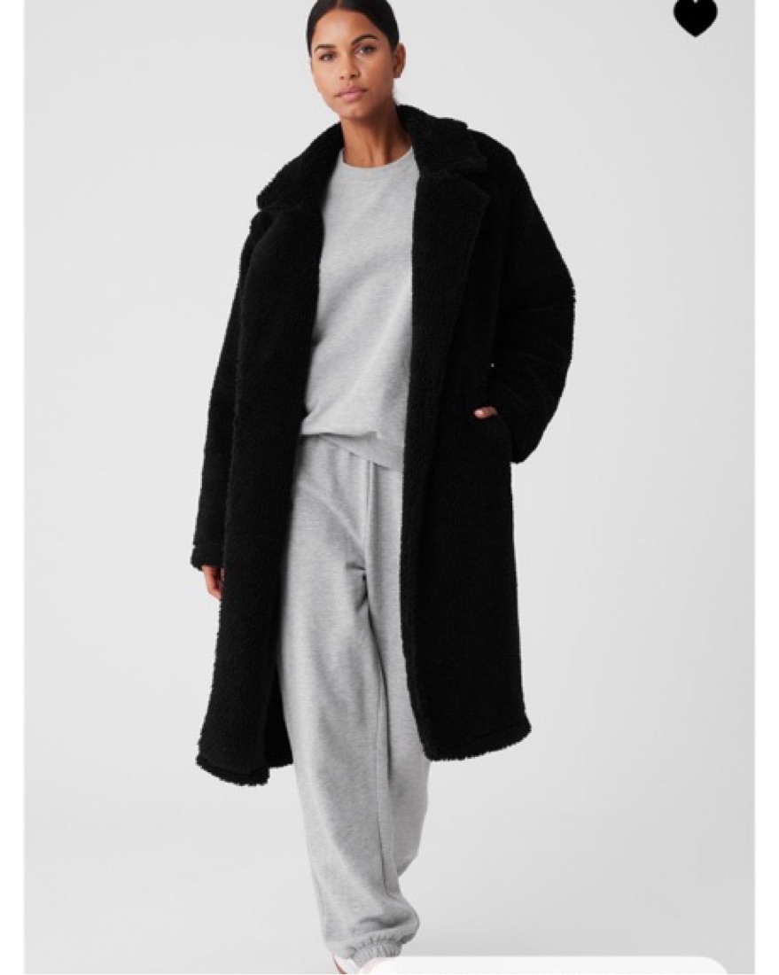 This stylish black Sherpa coat is perfect for elevating any winter outfit. Pair it with a dress for a night out or with jeans and a sweater for a cozy yet fashionable look.